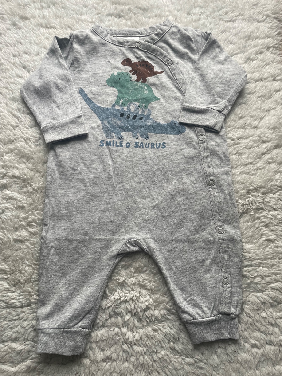 Svetlosedy pyzamovy overal s dinosaurami, celocvockove, ako nove, bez dier a flakov