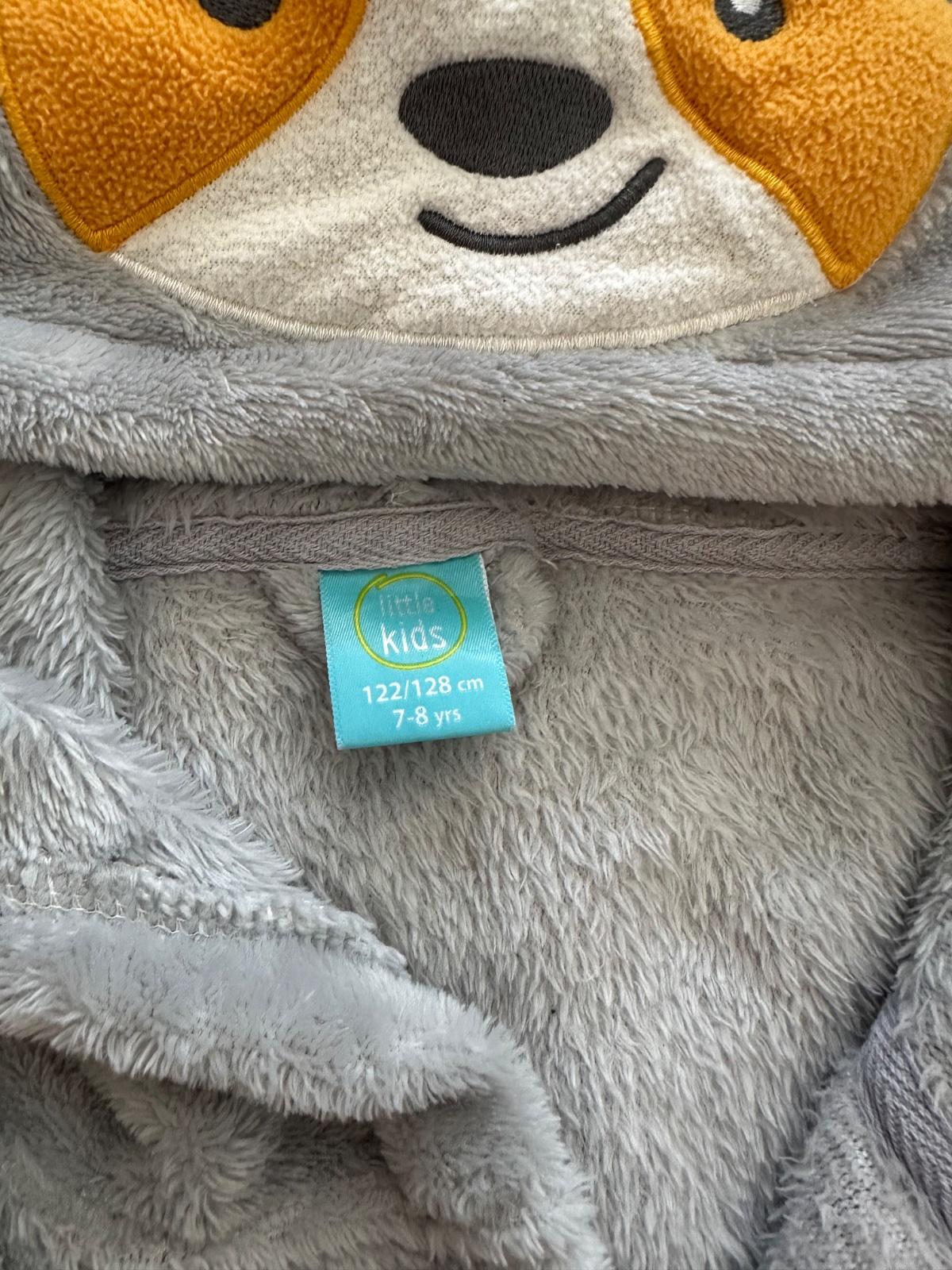 Krásny teplý župan sivej farby so vzorom, s kapucňou, bez zapínania, s opaskom, veľ.L, dĺžka 94 cm, skoro nenosený, materiál polyester.
