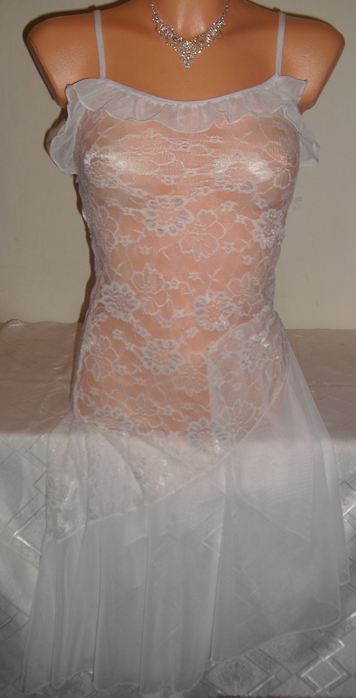 predam nadhernu svadobnu dlhu cipkovanu kosielku, elegantna, jemne priesvitna s asymetrickym volanikom , velkost ide elasticka na xs, s, s/m, vyborny stav, dlzka cca 127 cm spodnej casti volaniku.