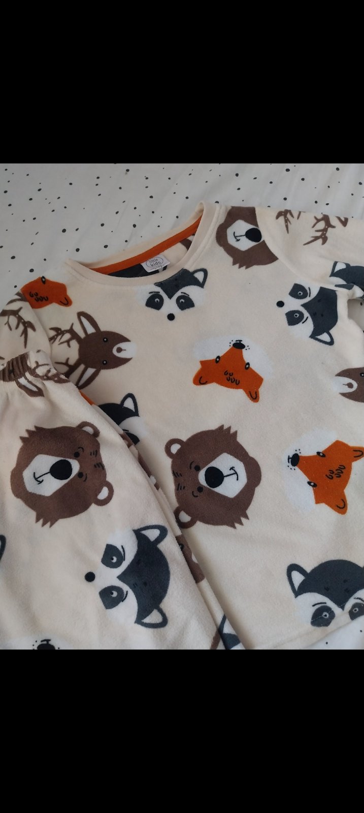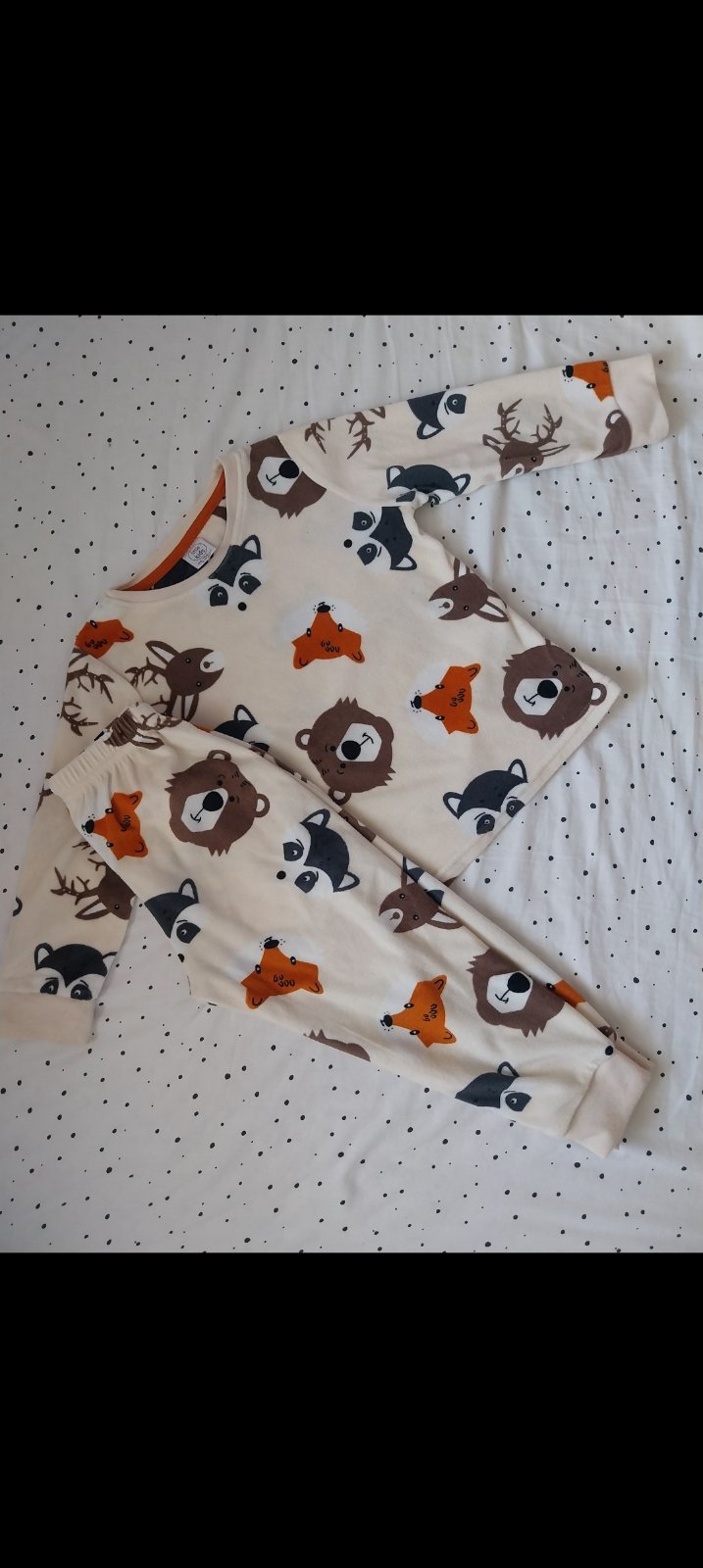 Predam teple pyzamo z makkeho flanelu. Pekny noseny stav. Vrchny diel sa mi pri prani trocha zafarbil, teraz je kremovy. Spodny diel je biely. Vrch: dlzka 64cm, sirka 58cm, rukav od sitia 49cm. Sp...