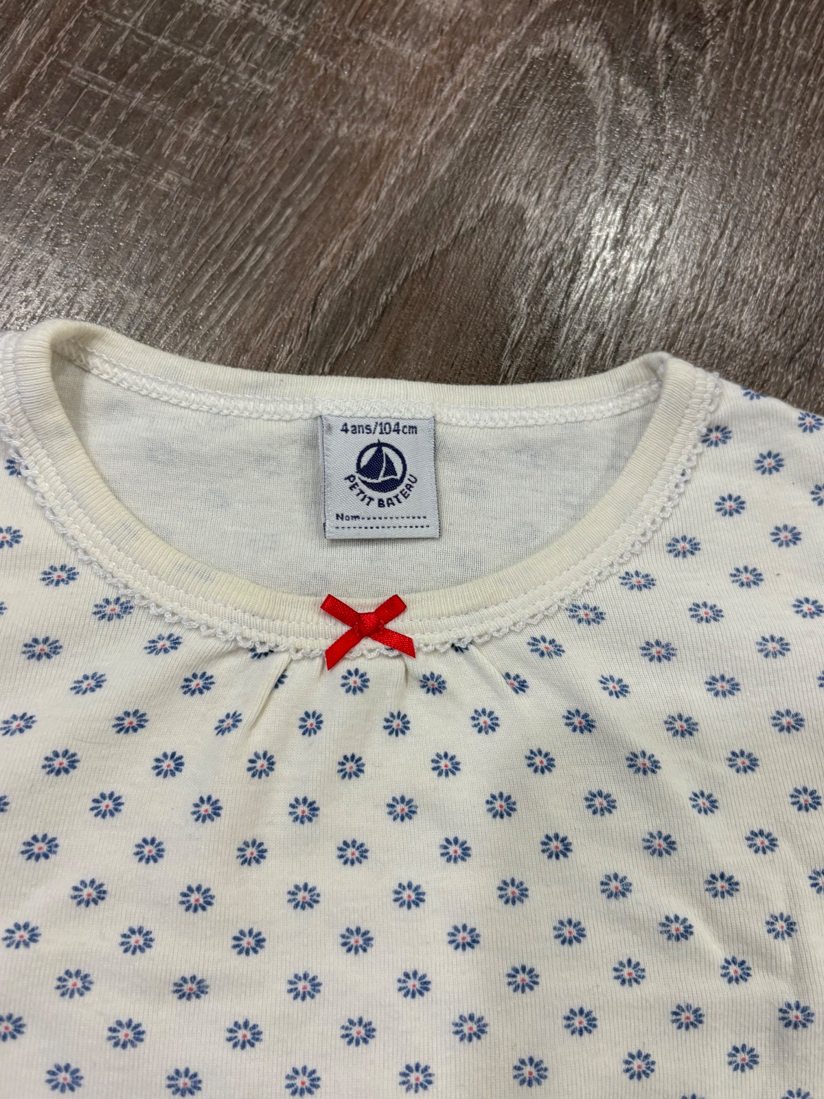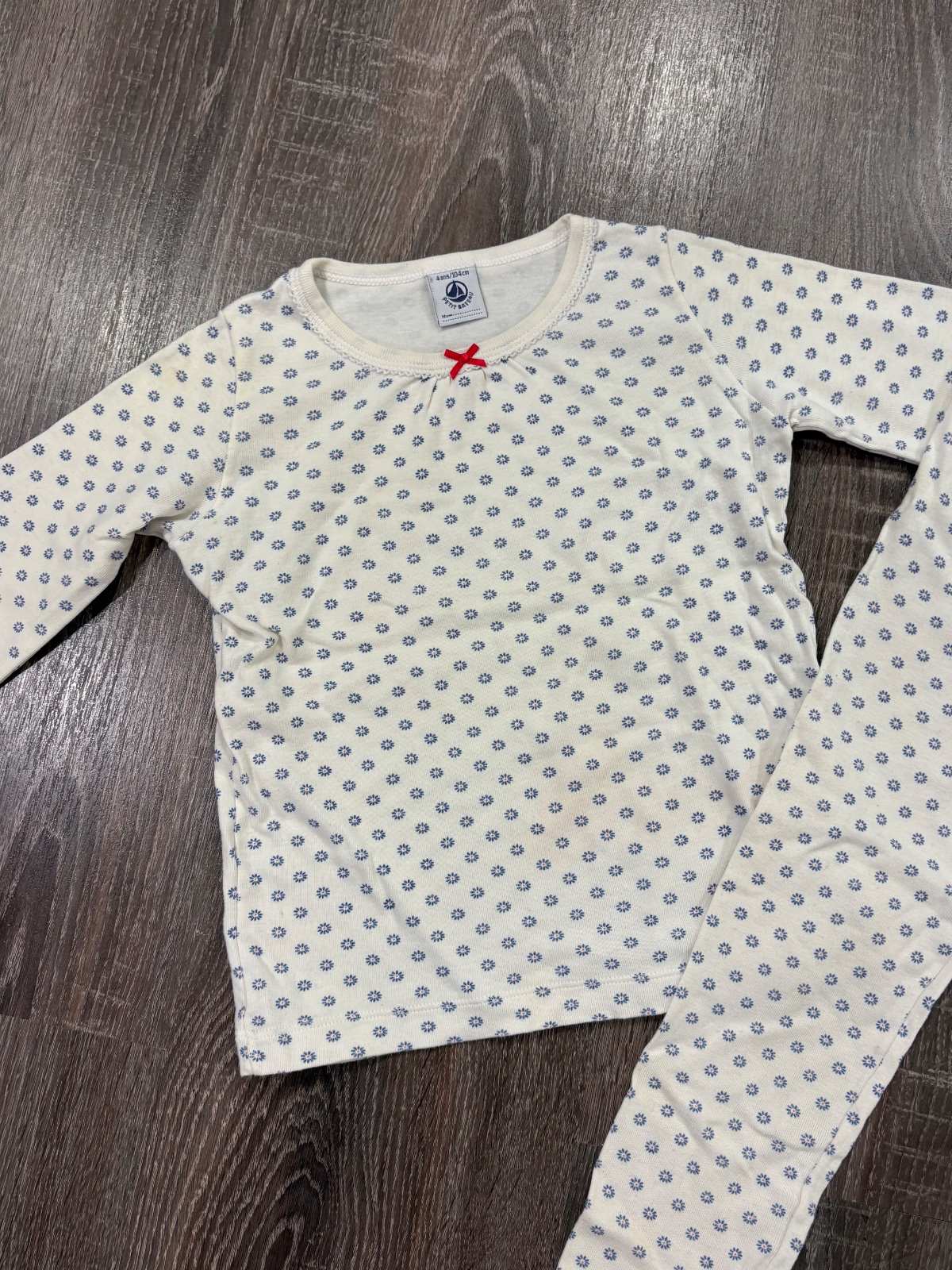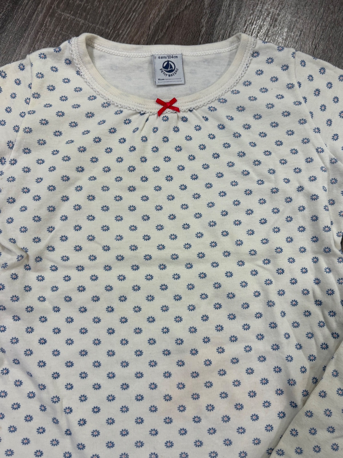 3.PETIT BATEAU krasne kvalitne dievčenské pyžamko, velkost je 104, na nohaviciach jemne pošpinenie, bez dier. dlžka vrchnej časti je 39cm, dlžka rukava od krku je 39cm a širka v podpazuší je od 33x2cm do 41x2cm.Spodná čast je dlhá 53cm a širka v páse je od 22x2cm do 34x2cm
