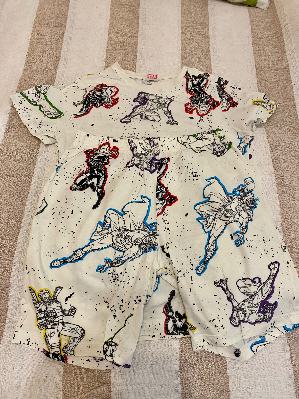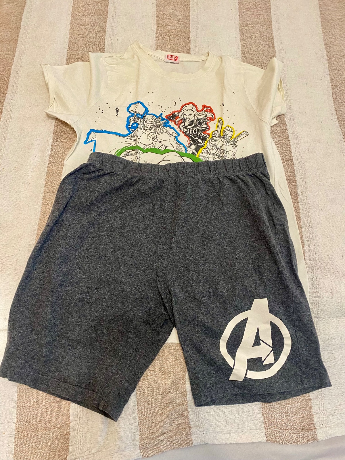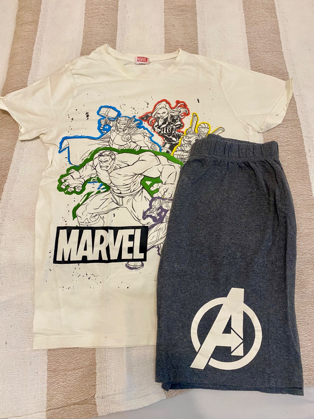 Predám sadu dvojdielneho pyžama Marvel Avangers. Sada obsahuje dve tričká a dvojo krátkych nohavíc. Vek 12. - 13 rokov, pás povolí do 78 cm, materiál 100 % bavna. Veľmi zachovalý stav.