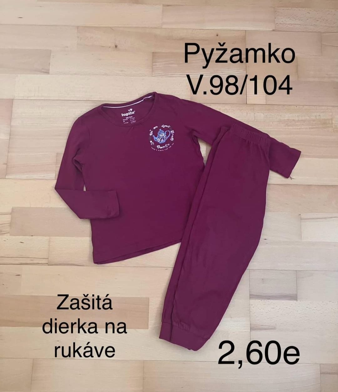 Hrube (take to frote, ale nie plysakovy material) pyzamo. Farba je skor bordoval ako cervena, tazko ju zachytit na fotke. Vrch pyzama je pasikavy, nohavice su bordove. Velkost 98/104, Kuniboo.