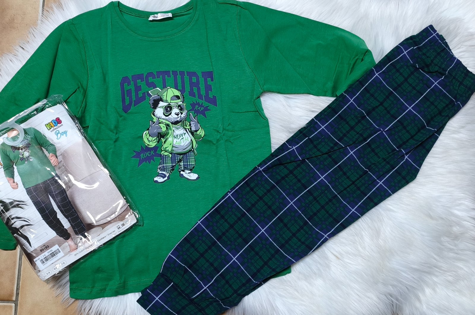 Detské bavlnené pyžamo zelené s karo nohavicami