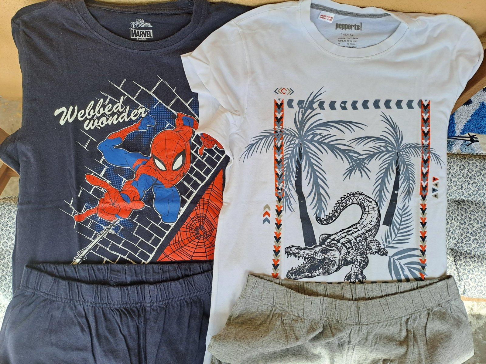 Predám letné dvojdielne pyžamka. Značky: Pepperts ma malú dierku na kraťasoch. Veľkosť 146/152. Značky: Sinsay veľkosť 152. Predaj. iba spolu - cena za 2 kusy.