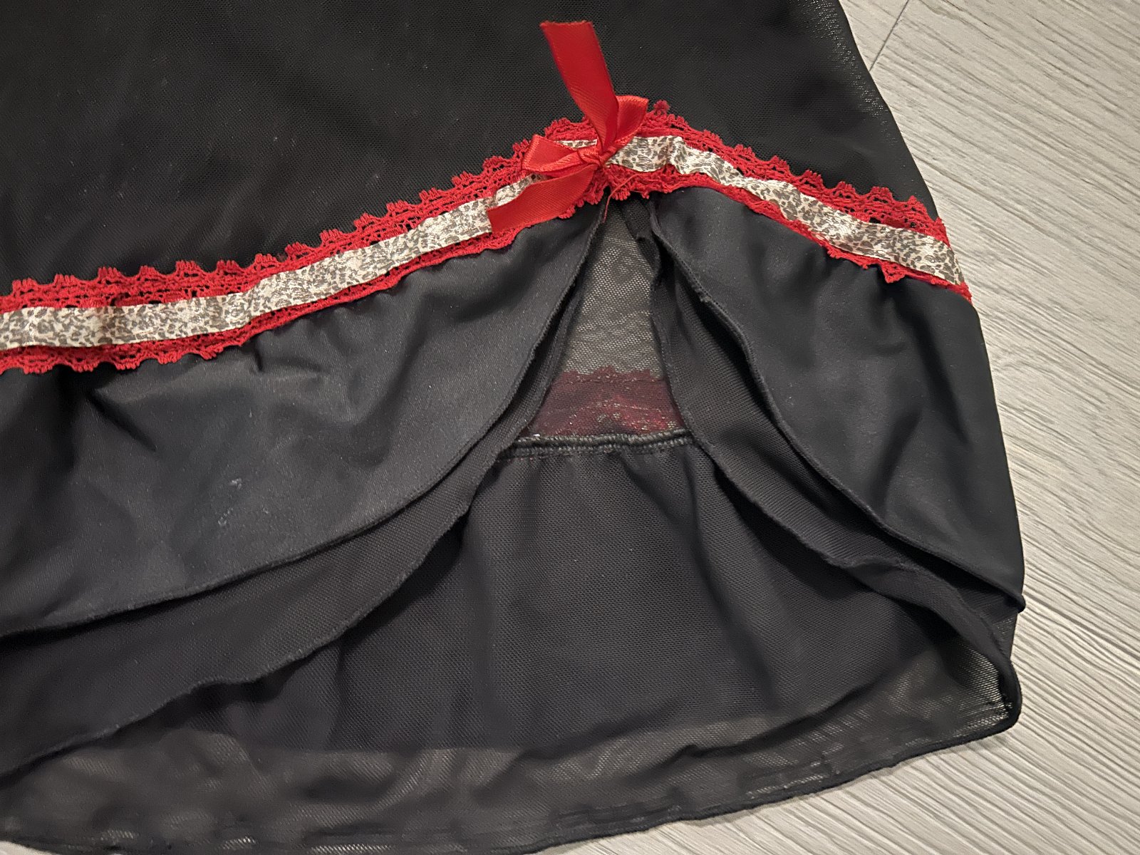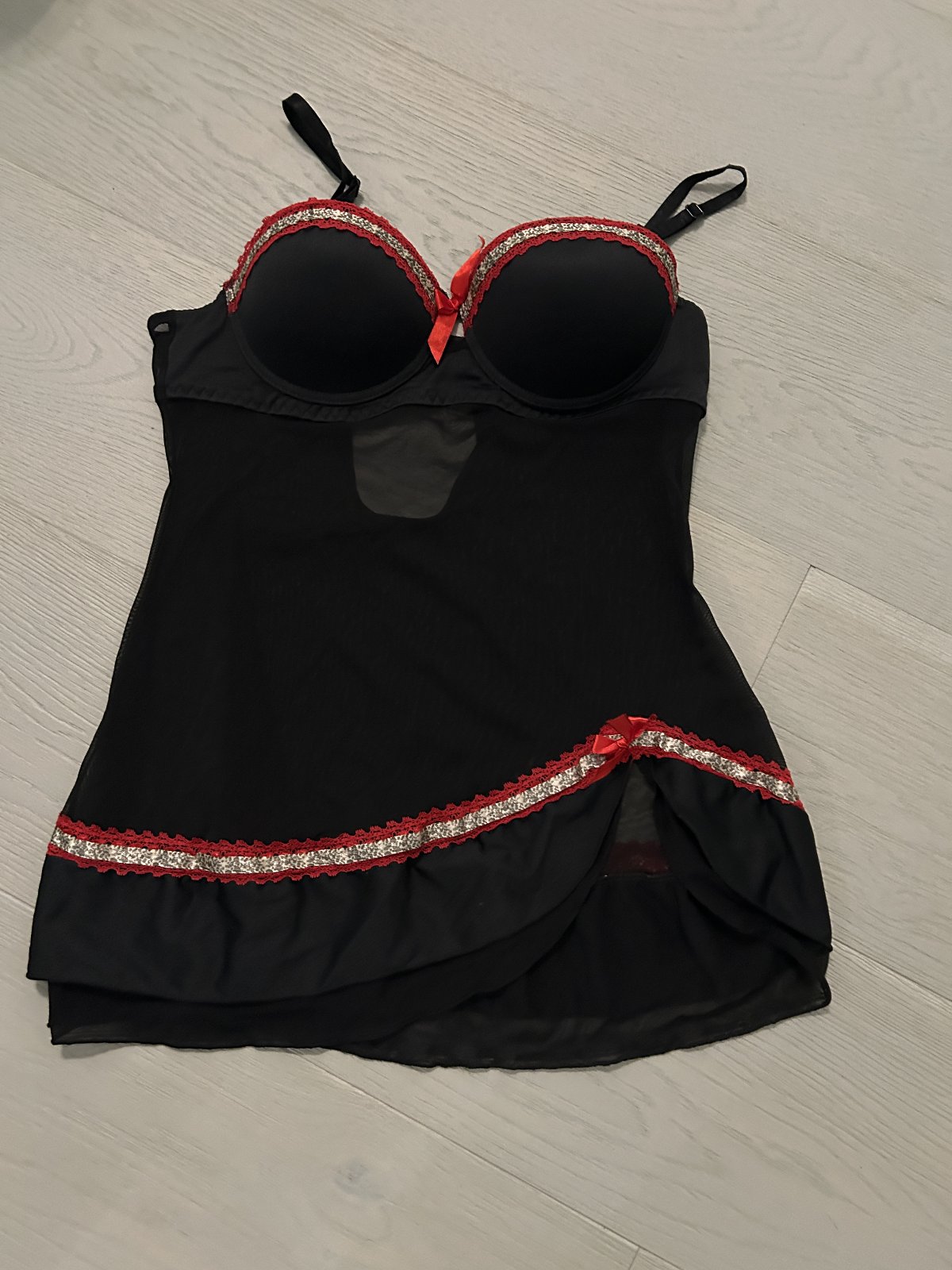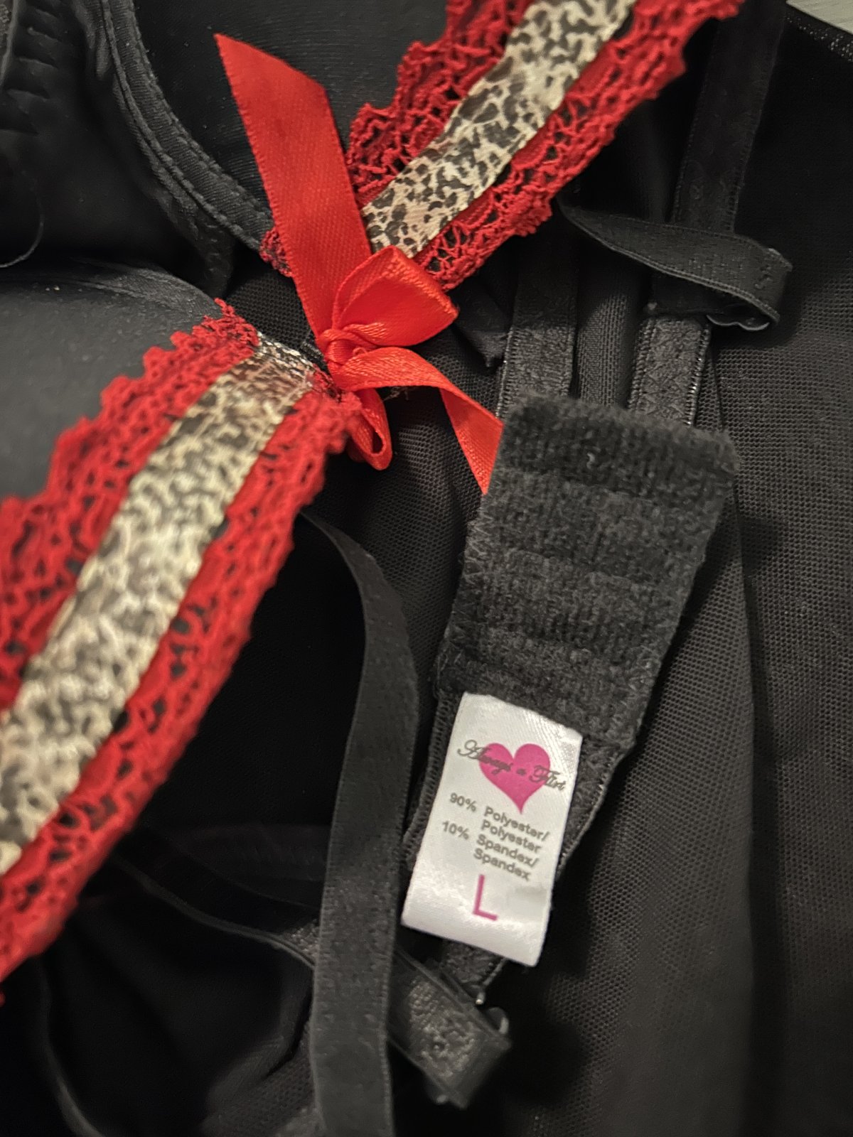 čiernej farby zdobená červenozlatou krajkou, vystužené košíky odhadom B, nastaviteľné ramienka, obvod pod prsiami 80 cm- elastický materiál. Kupovaná v USA, uvedená veľkosť L, ale skôr také M. Dĺžka od okraja podprsenky 61 cm