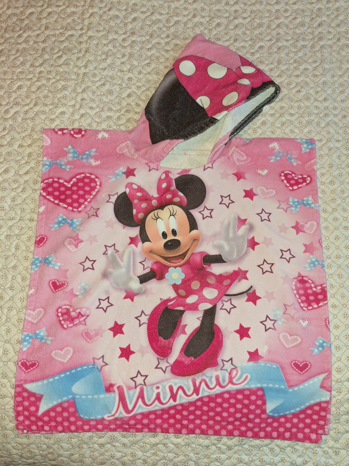 Dievčenské pončo. Jemné žmolky, inak bezchybný stav. Nositeľné vo veku 2-5 rokov, čiže odhadom zodpovedá veľkosti 92-110. Celková dĺžka s kapucňou 80 cm, rozmer samotného ponča 54x54 cm.