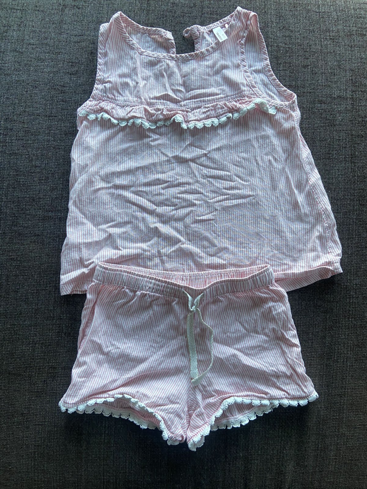 Prekrásne pyžamo, veľmi príjemné, ľahučké, chladivé. Pásikavé s čipkou. Veľmi obľúbené. Veľkosť písaná 110/116, ale moje nosili dlhšie pred aj po :) Odporúčam do horúcich letných nocí, stále vyzerá ako nové. Cena bez pošty