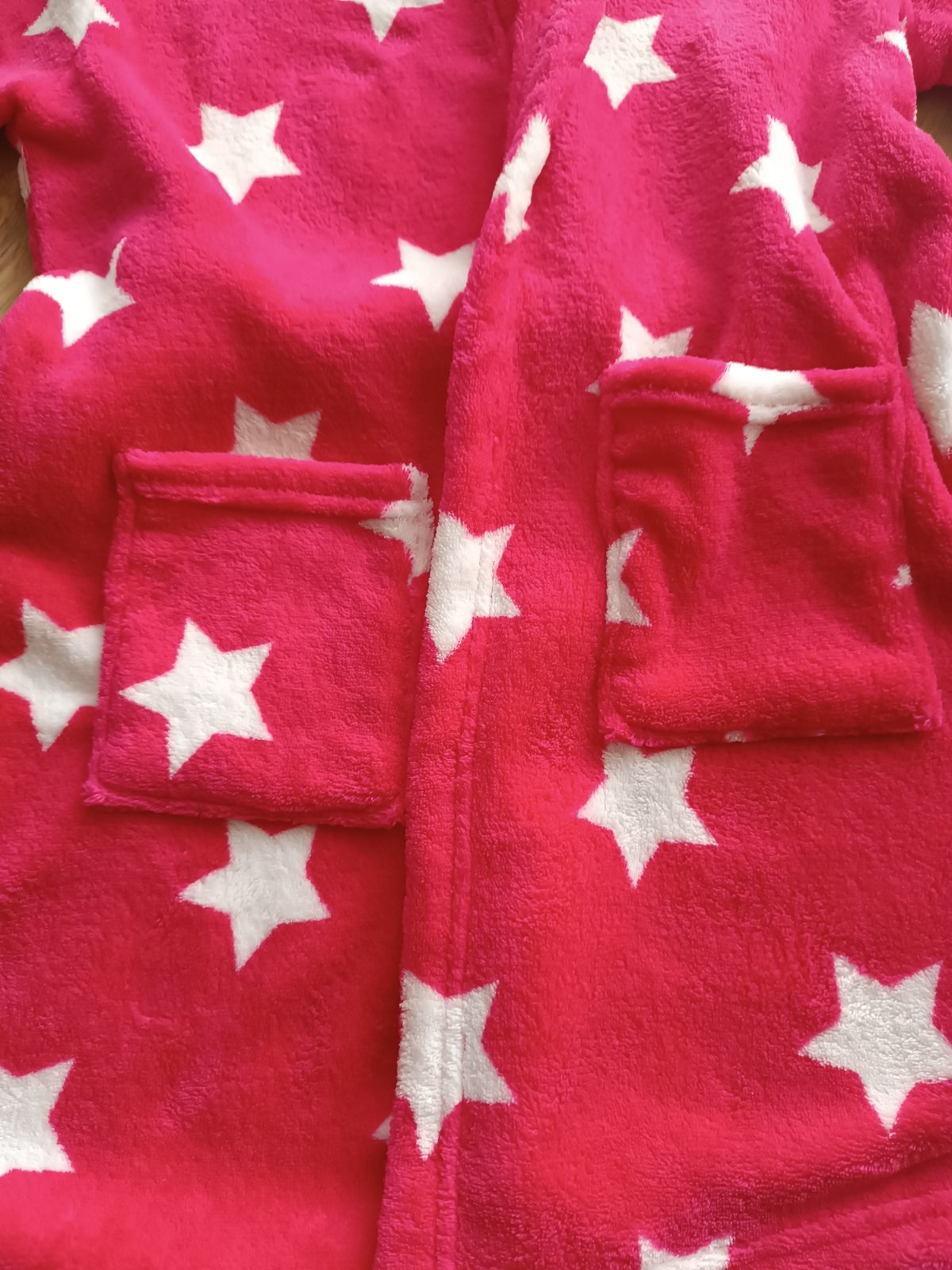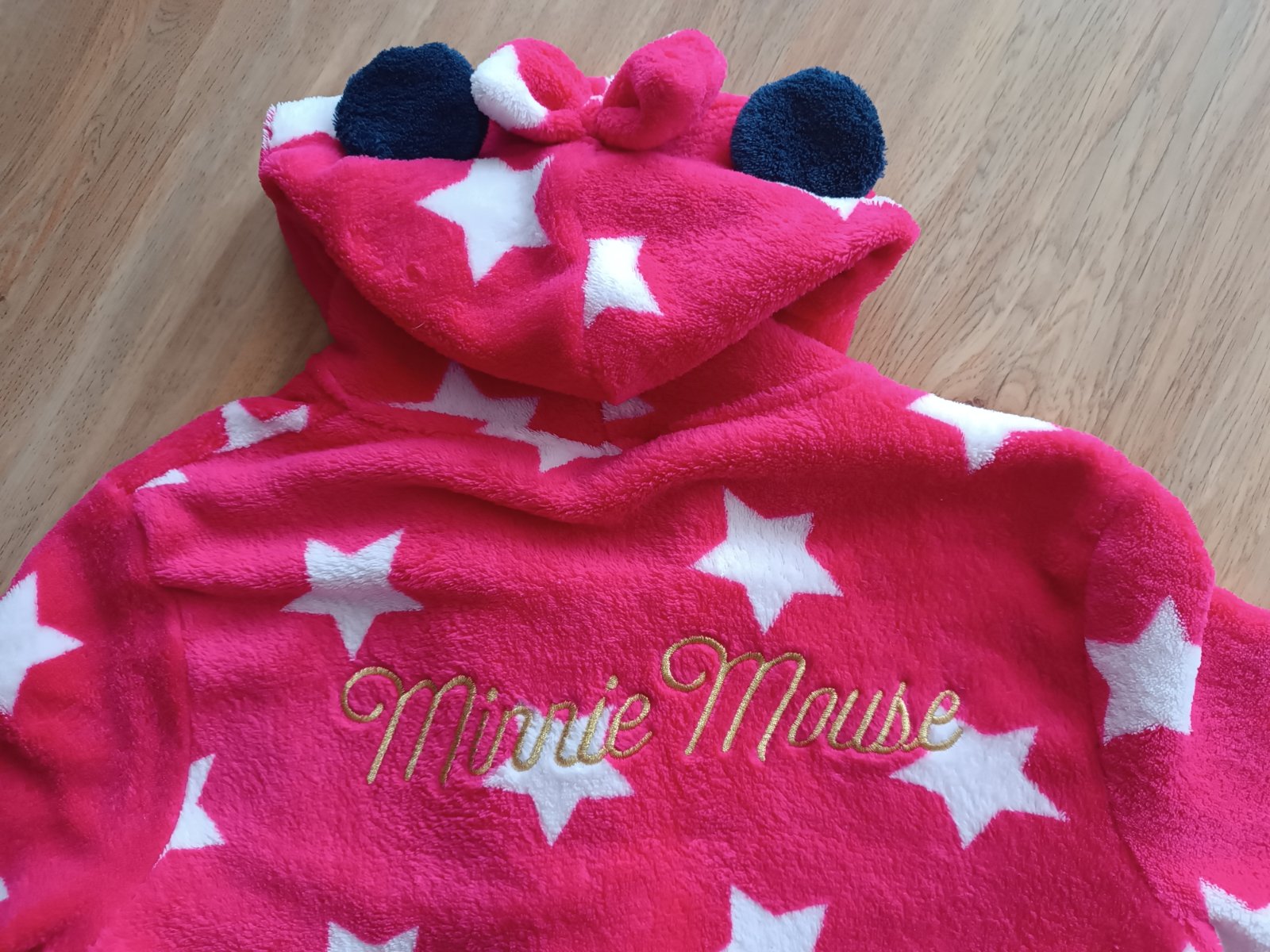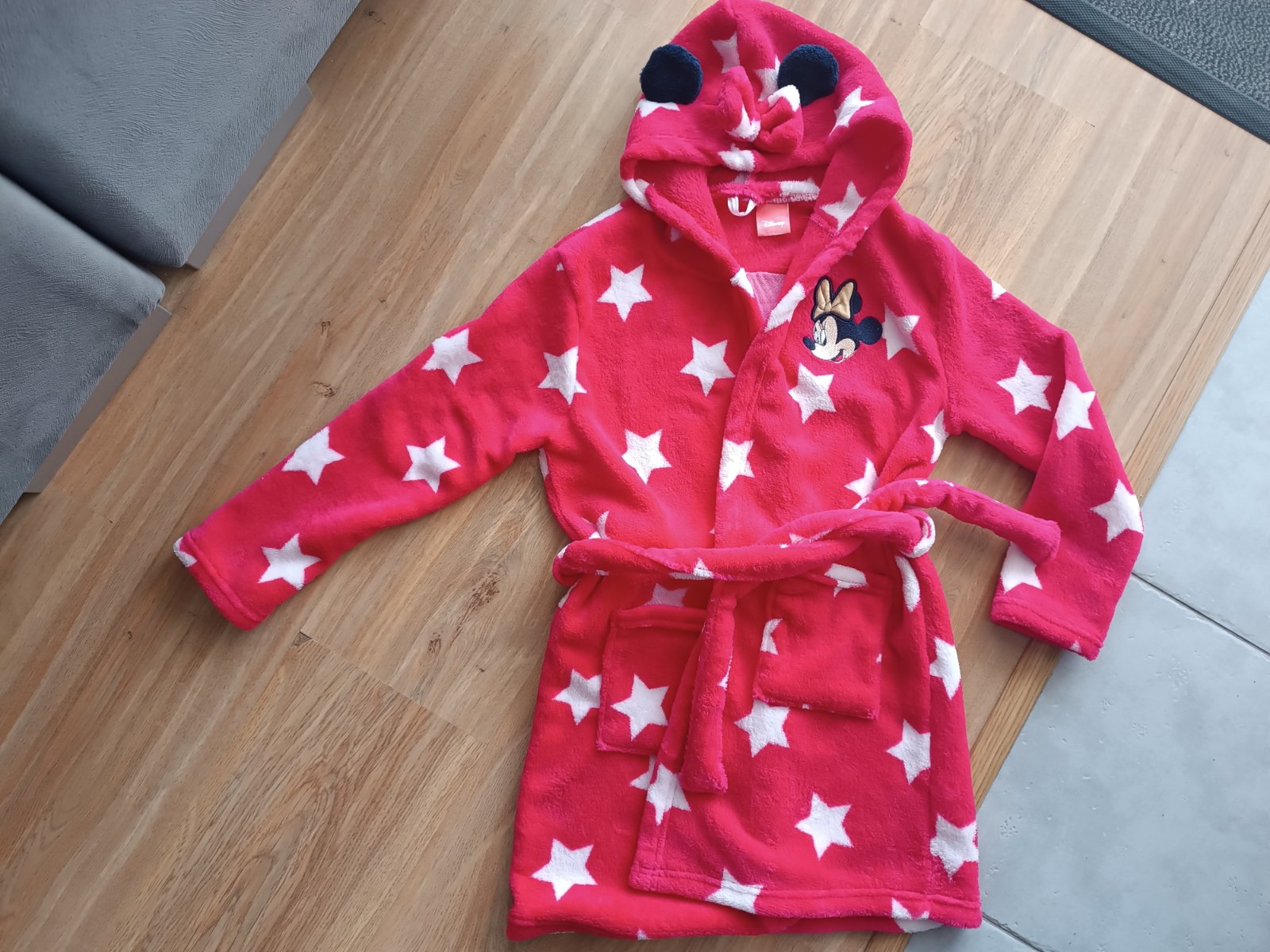 Krásny, mäkký Minnie Mouse župan od Disney, veľ. 122/128, červená farba s hviezdičkami, dve vrecká vpredu, opasok, ušká a mašlička na kapucni. Veľmi dobrý stav, žiadne poškodenia.