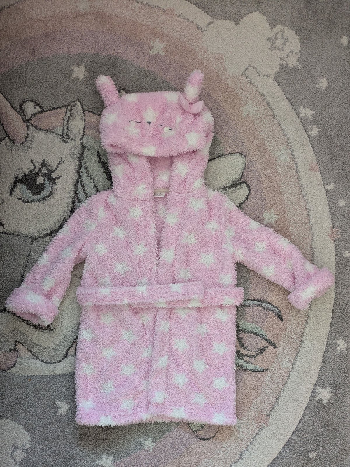 Chlpatý župan podšitý úpletom v dobrom nosenom stave, veľkosť je na 12-18 mesiacov. Opasok je našitý.