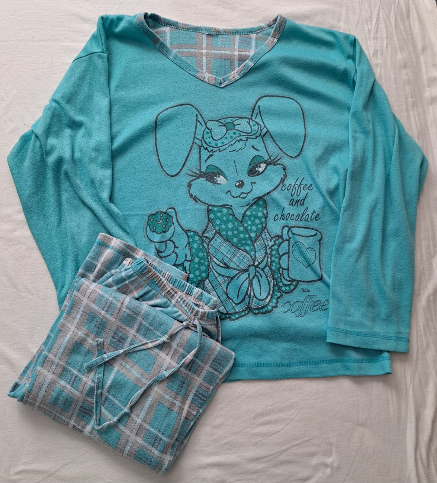 Ponúkam na predaj dámske huňaté/plyšové pyžamo v tyrkysovej farbe, s obrázkom pandy. Pyžamo je elastické, veľkosť L, sedí na skôr na M. Len opraté, nenosené. Čiže nové.
