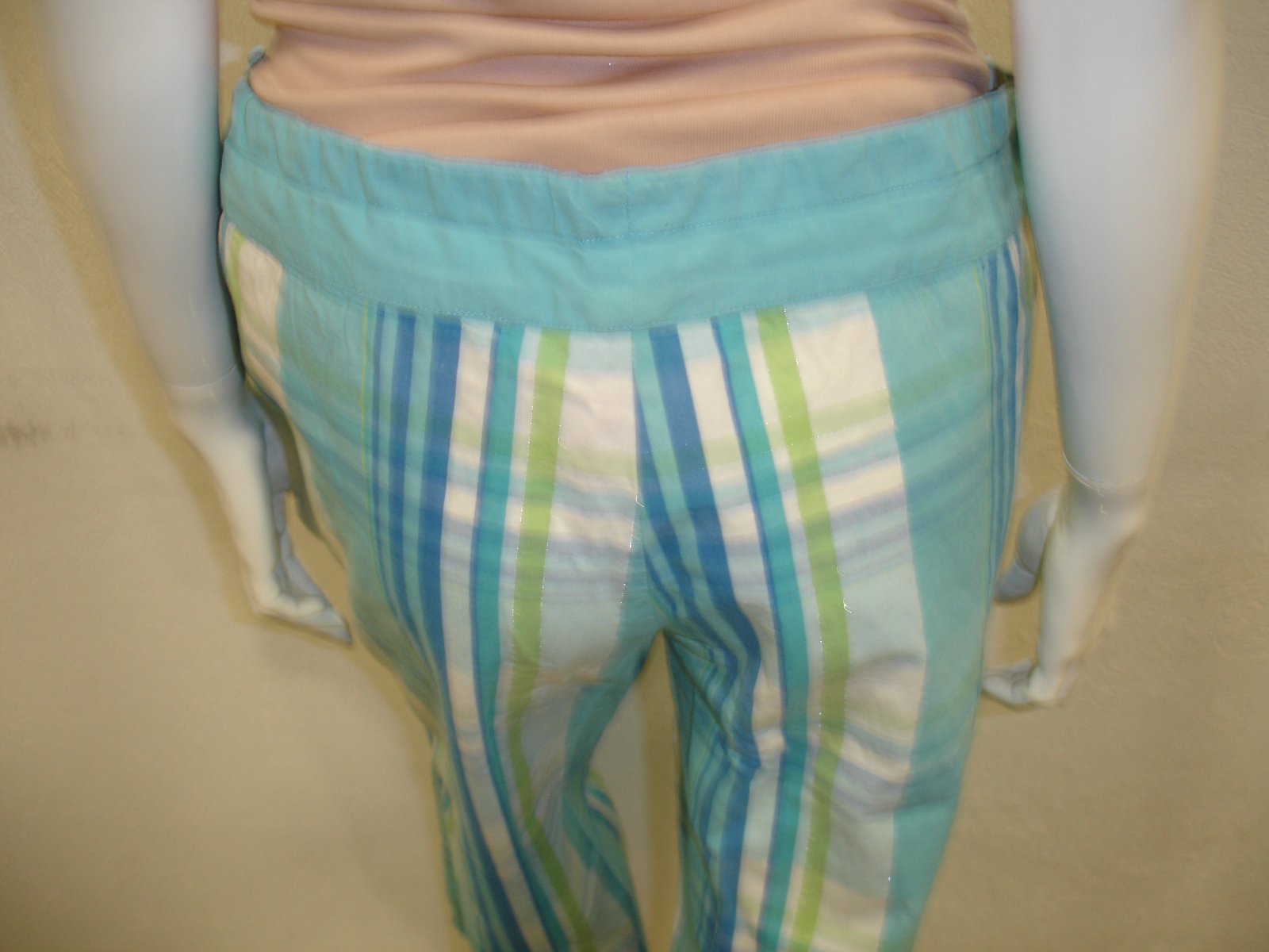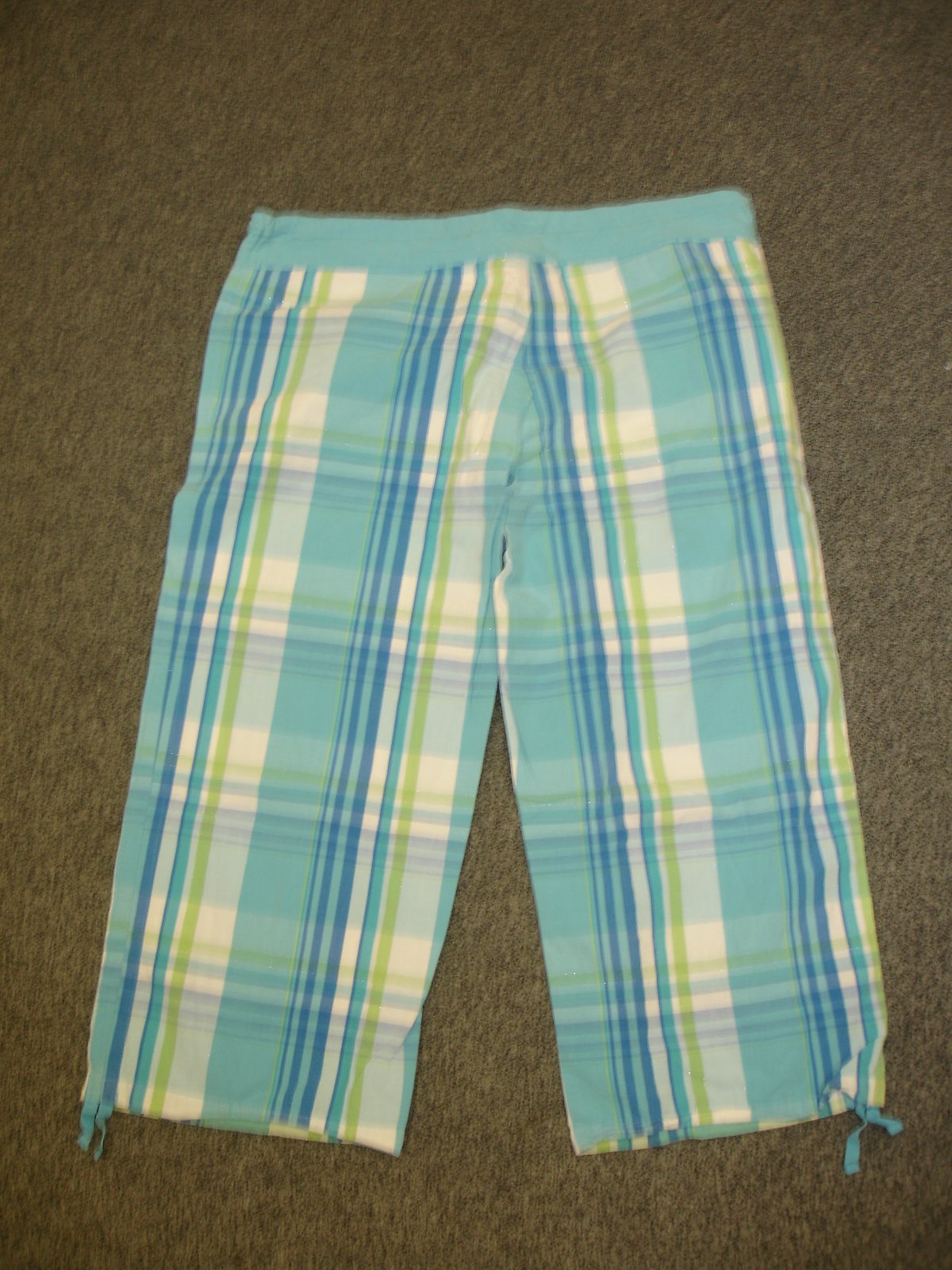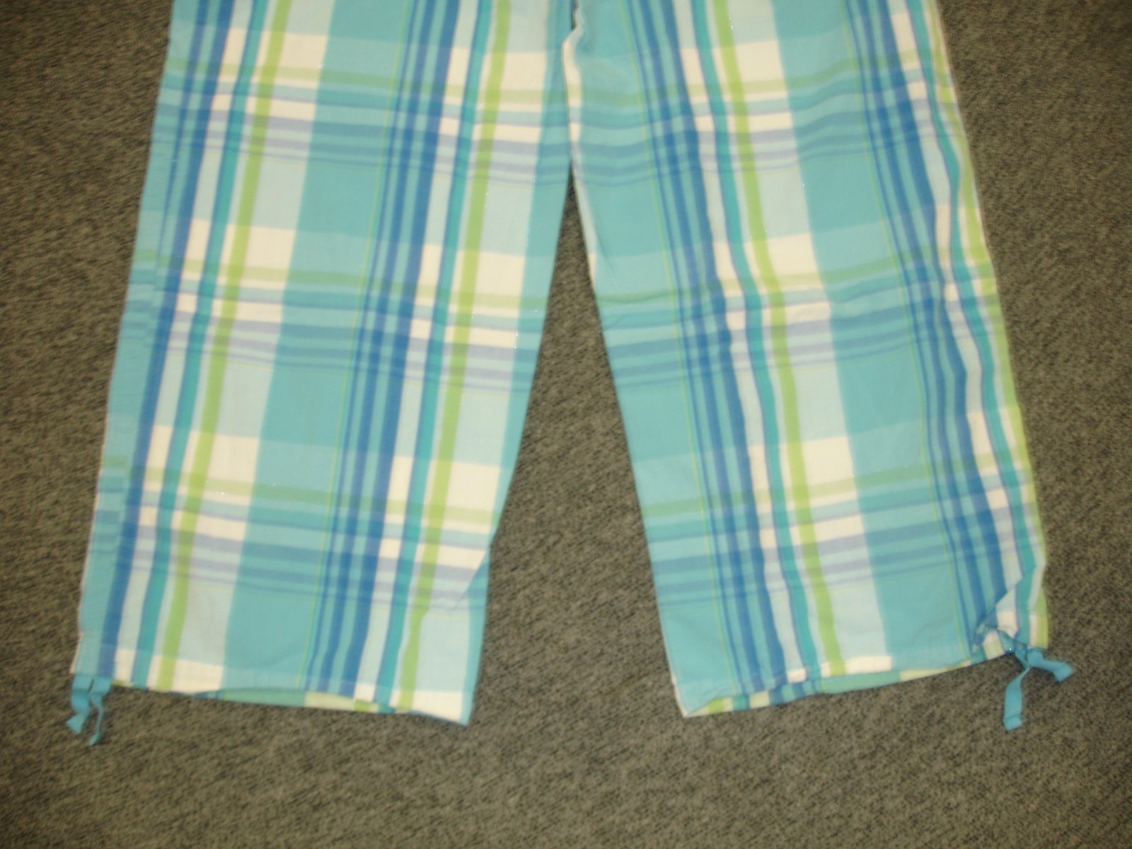 Nosené bez poškodenia alebo žmolkov. Značka je La Senza , materiál je 99% bavlna a 1 % lurex. Sú to 3/4 nohavice. Rozmery sú bočná dlžka 77 cm , sed je 30 cm , šírka v pase v nenatiahnutom stave je 46 cm x 2 , sú na šnúrku.