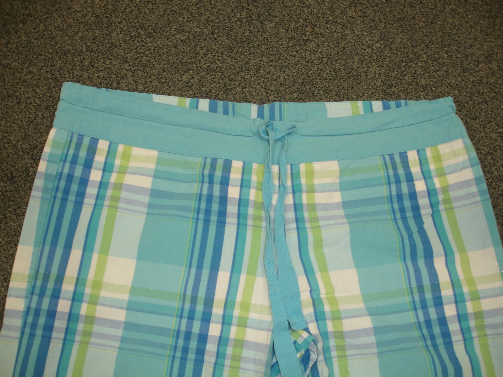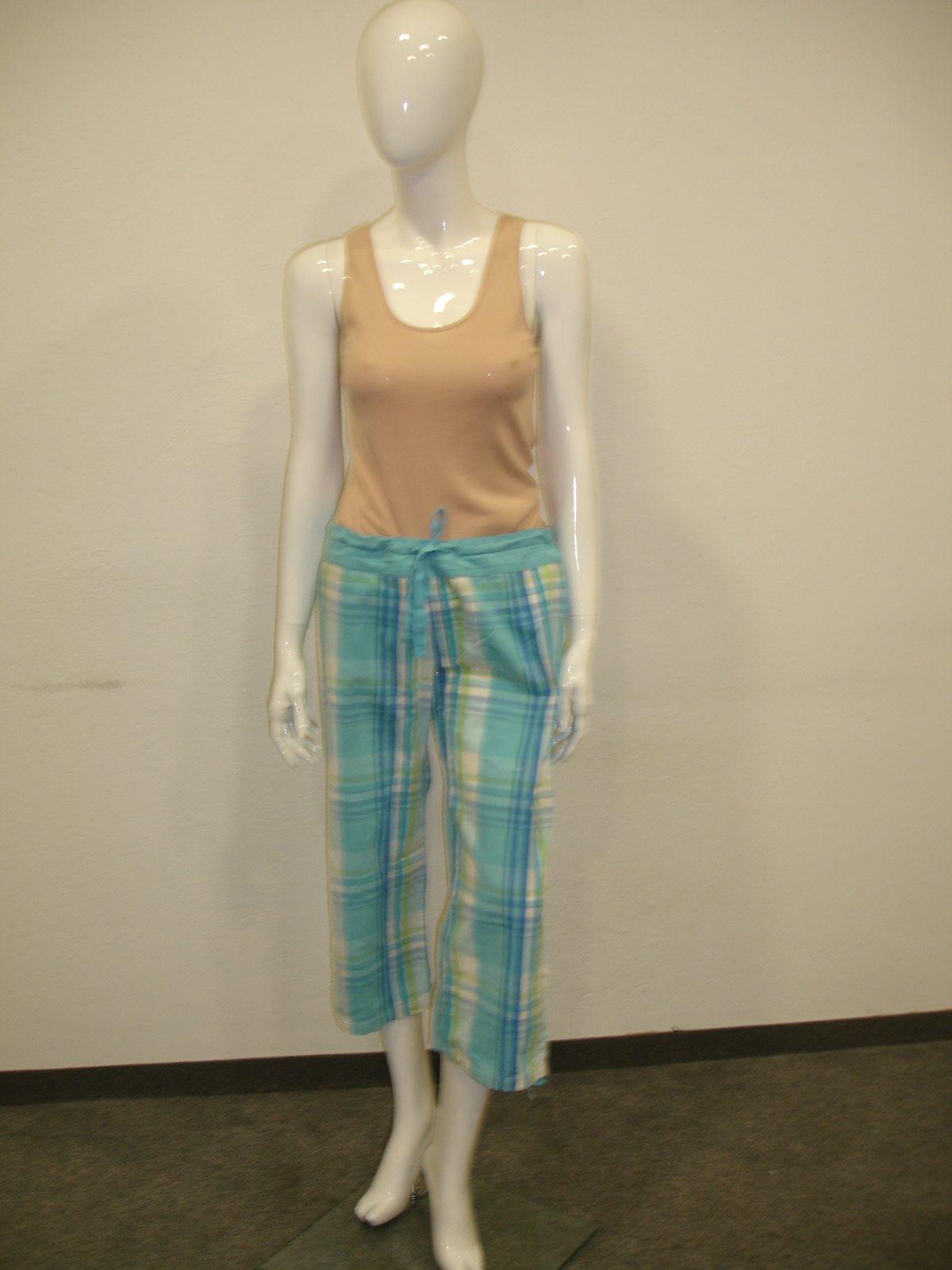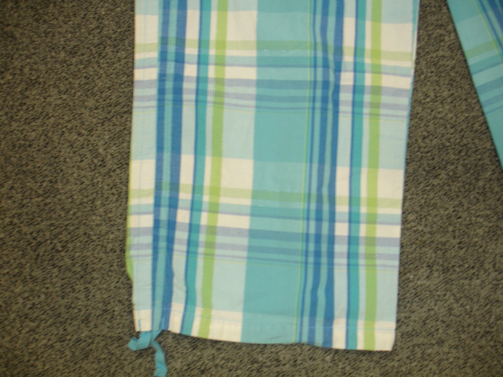 Nosené bez poškodenia alebo žmolkov. Značka je La Senza , materiál je 99% bavlna a 1 % lurex. Sú to 3/4 nohavice. Rozmery sú bočná dlžka 77 cm , sed je 30 cm , šírka v pase v nenatiahnutom stave je 46 cm x 2 , sú na šnúrku.