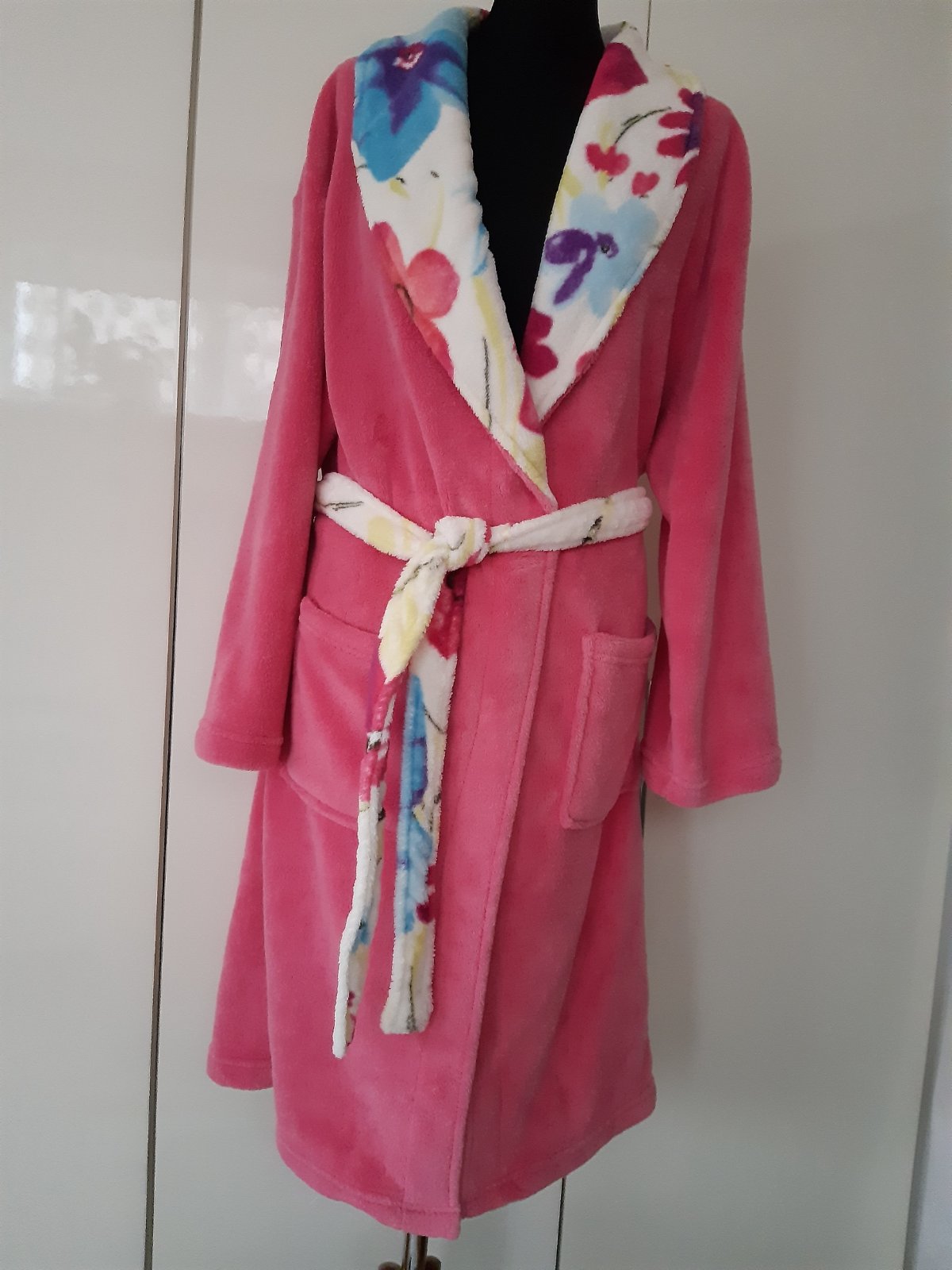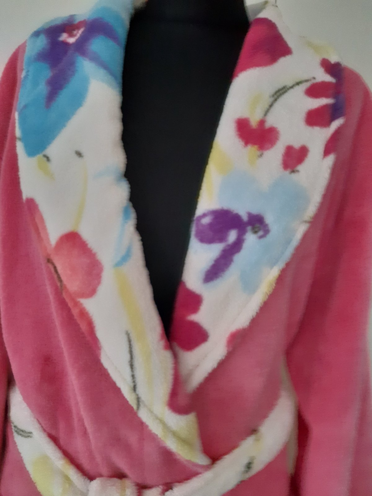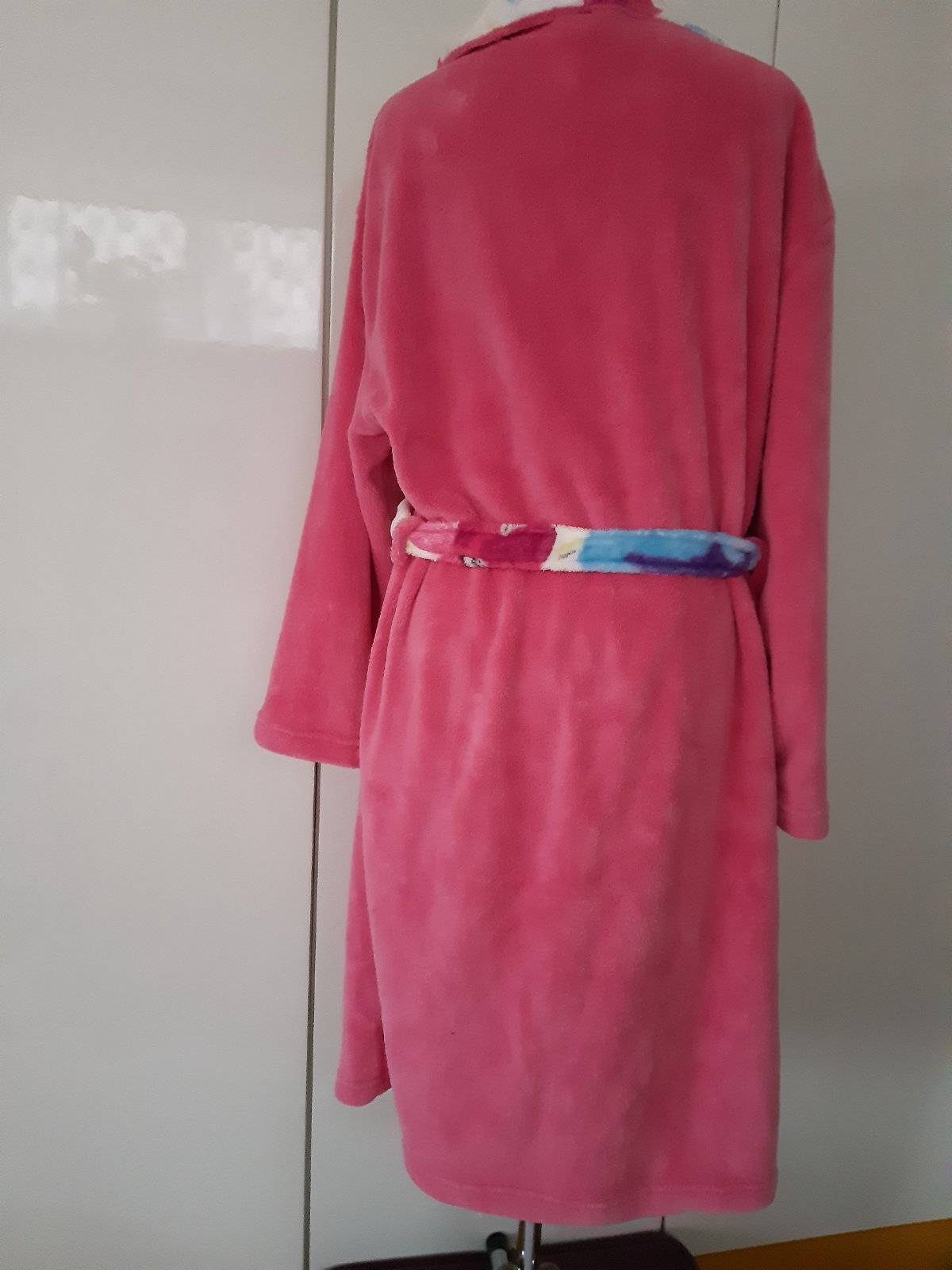 Krásny, teplý strednej hrúbky. Materiál-100% polyester, príjemný, mäkký, hebký, akoby z kožušinky. Dl. 109 cm, podľa výšky postavy môže byť kratší, dlhší.... Dl. rukáva od krku,je to spadnutý rukáv 74 cm, šírka cez prsia 55x2 cm. Udávaná veľkosť na visačke je L 42/44. Župan je vo výbornom stave, bol málo používaný.
