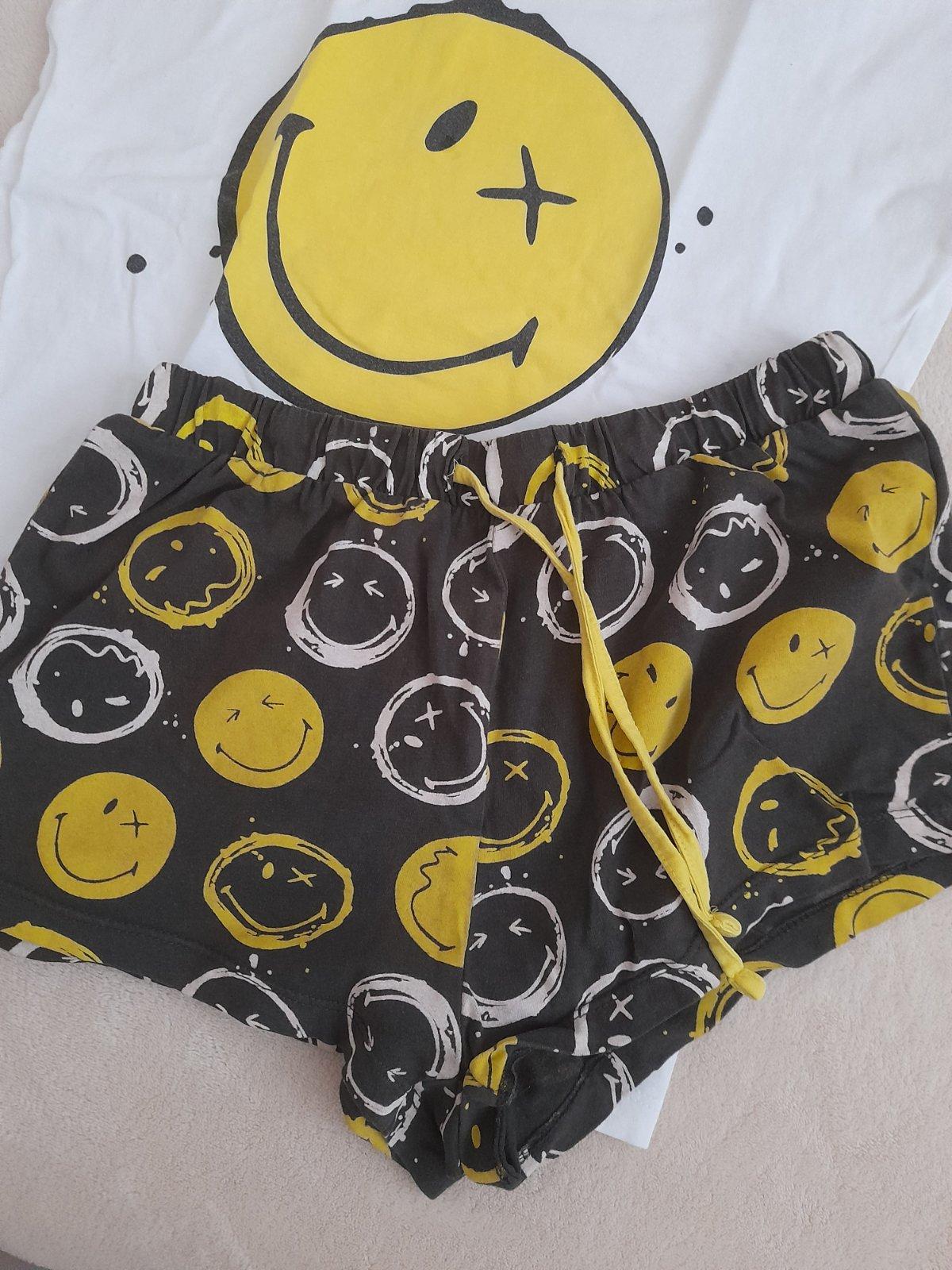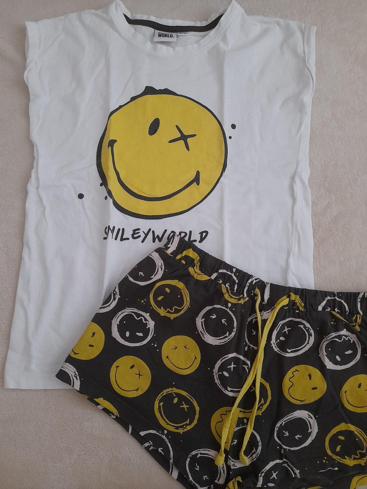 Pyžamko s krátkym rukávom a šortkami. Kúpené v Pepco. Veľkosť písaná 146/1152. Vrchný diel; celková dĺžka vpredu je 48 cm a vzadu 54 cm šírka 42 cm, Spodný diel celková dĺžka po rozkrok 25 cm a pás...