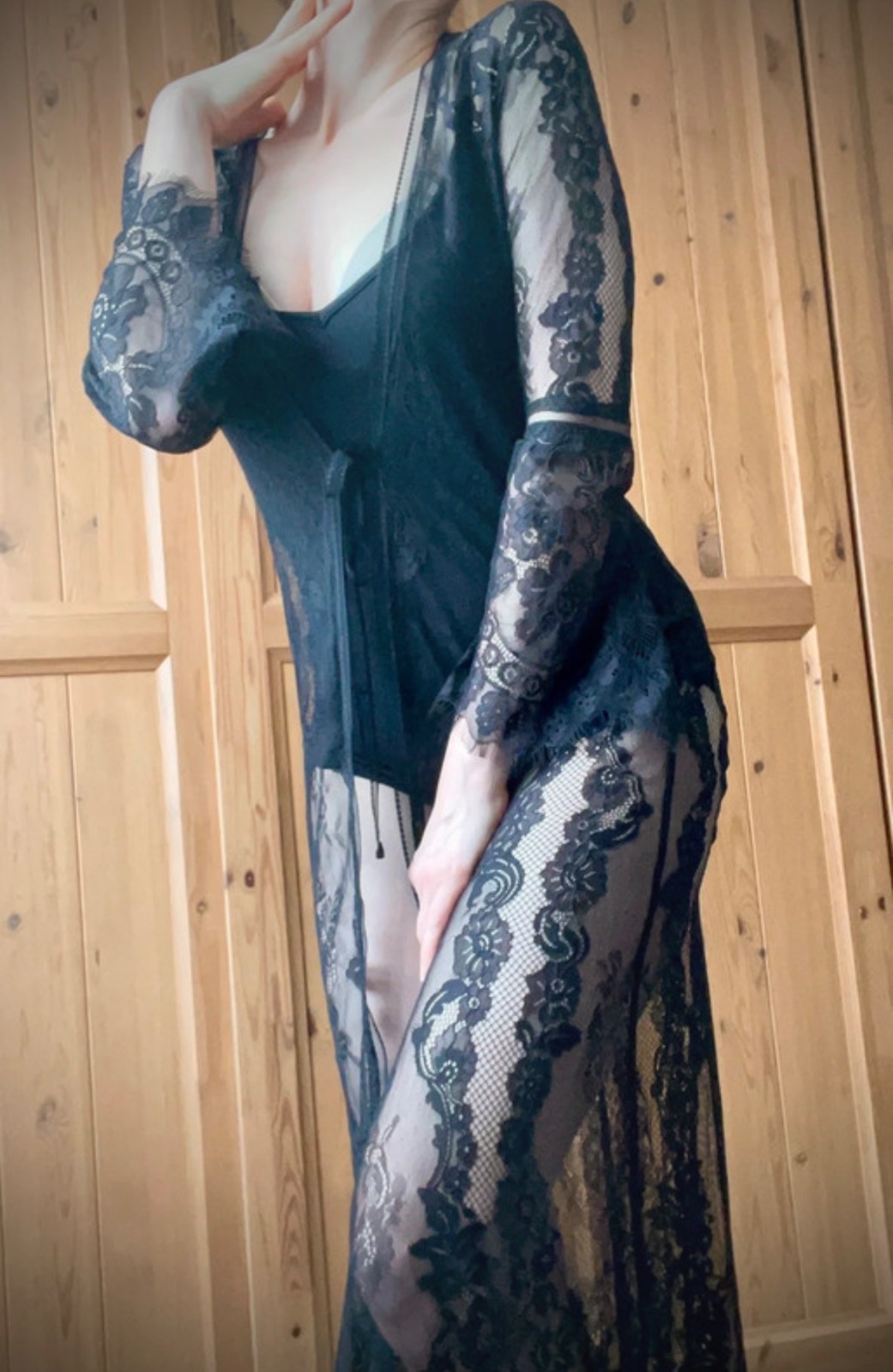 Dizajnérsky plážový župan z francúzskej čipky v čiernej farbe od poprednej slovenskej módnej návrhárky Jany Pištejovej. Je bezúdržbový, absolútne nekrčivý. Viaže sa na tenkú stužku v hrudníkovej časti. Celková dĺžka je cca 140cm. Jedenkrát vzatý.