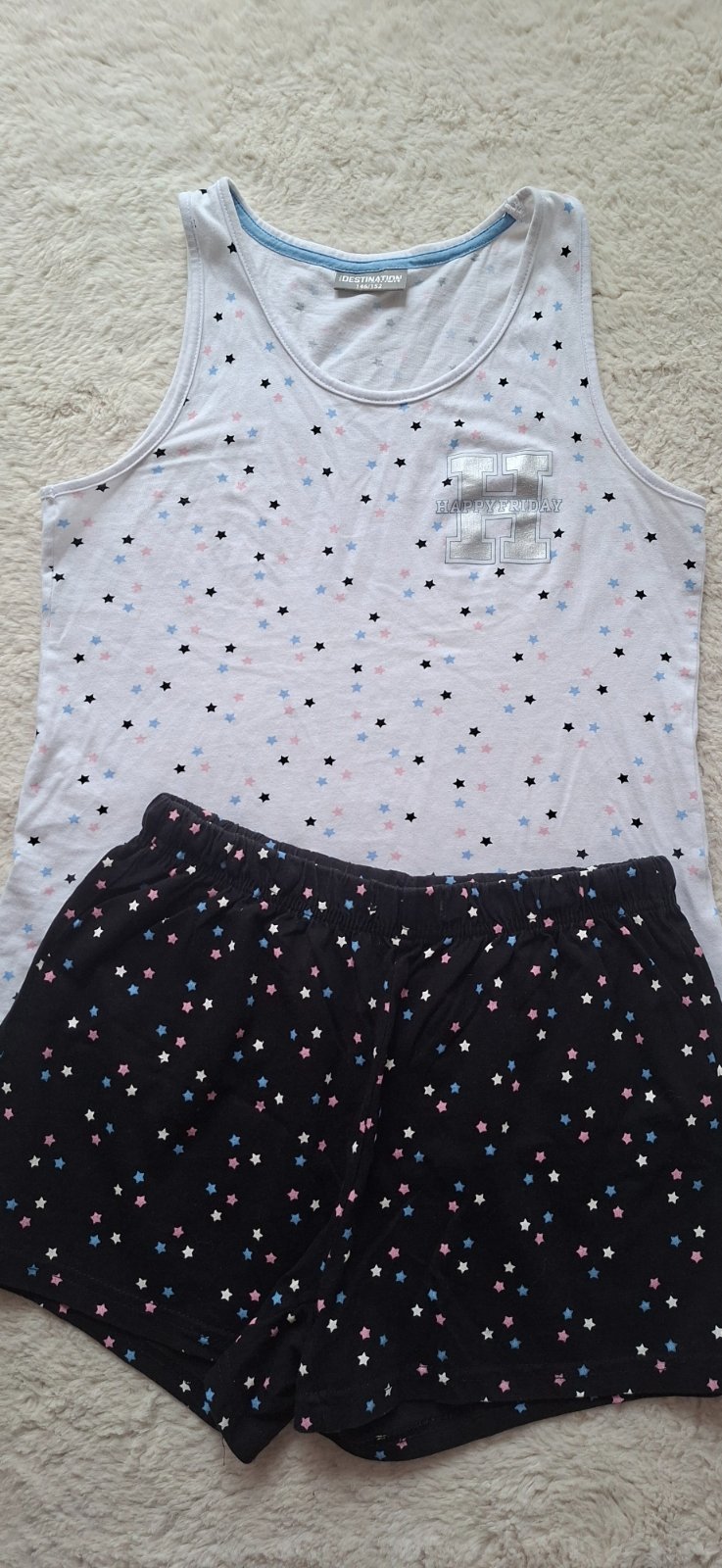 Pyžamko s krátkym rukávom a šortkami. Kúpené v Pepco. Veľkosť písaná 146/1152. Vrchný diel; celková dĺžka vpredu je 48 cm a vzadu 54 cm šírka 42 cm, Spodný diel celková dĺžka po rozkrok 25 cm a pás...