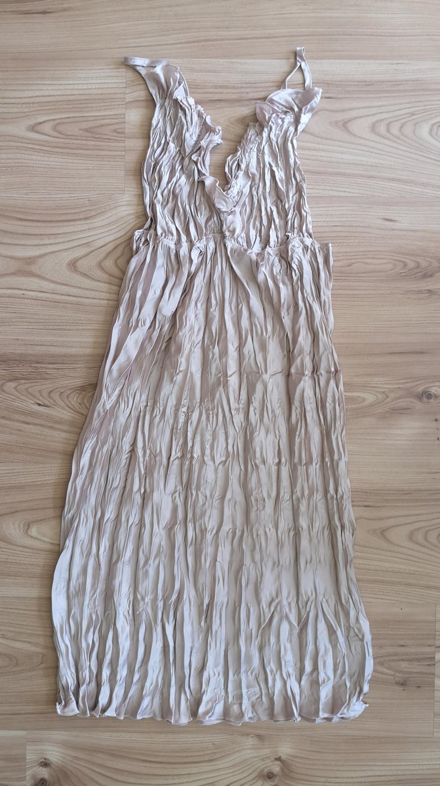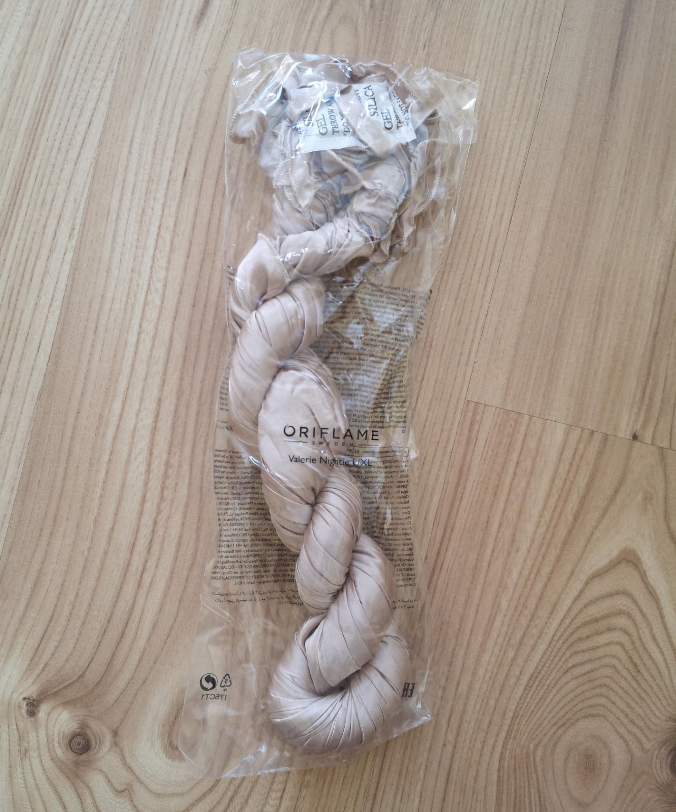 Zmyselná nočná košieľka pokrčeného vzhľadu z jemného polyesterového saténu. Má nežný béžový odtieň a špagetové ramienka s prispôsobiteľnou dĺžkou. Veľkosť L/XL, materiál 100%polyester, dlhá s ramienkom 105cm, dĺžka spod poprsia je 73cm, obvod pod prsiami 2x36 až 2x56cm.