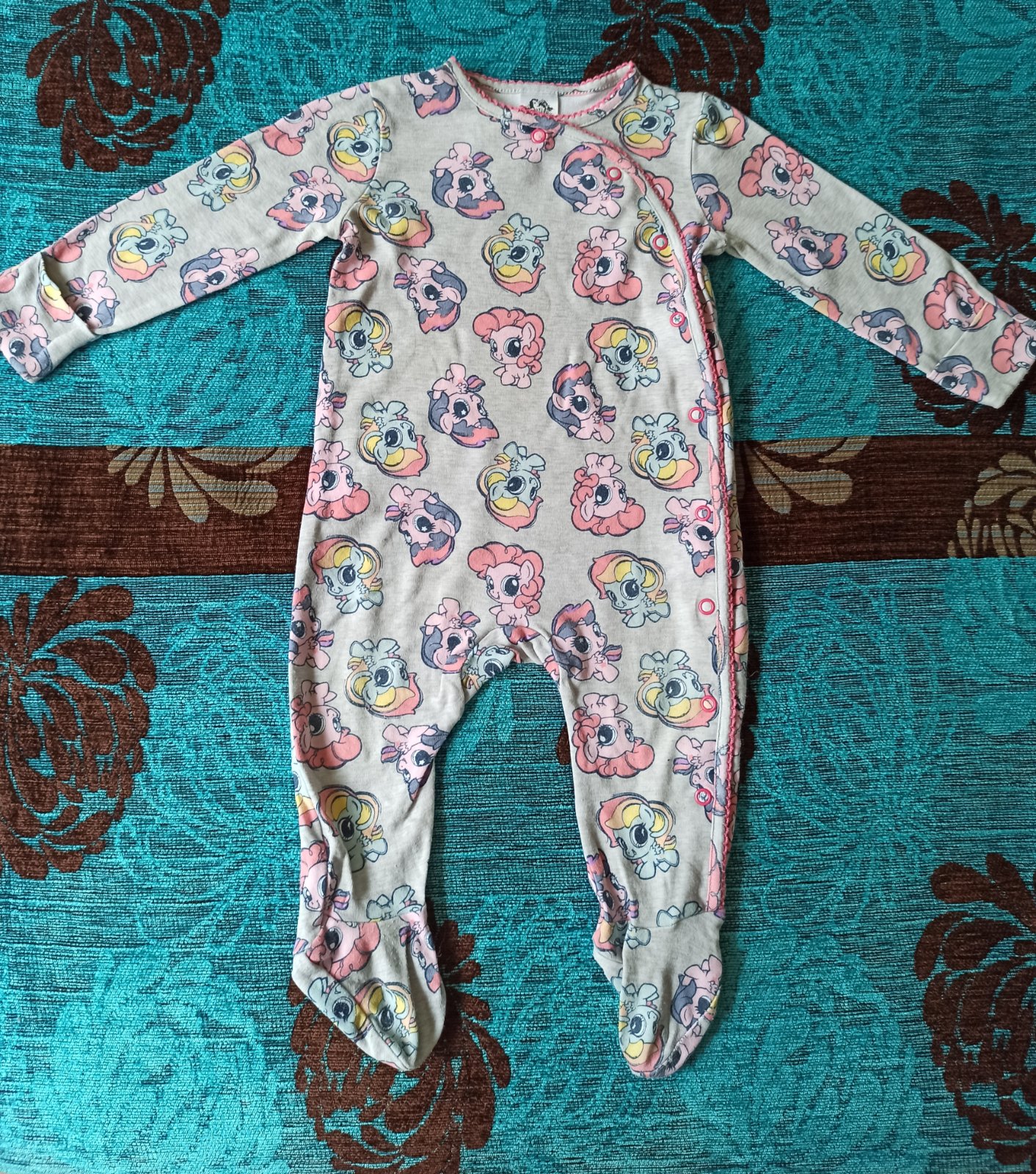Overal na spanie F&F pre dievcatka so zapinanim na cvoky na ramienku a v oblasti plienok. Vidiet noseny stav
