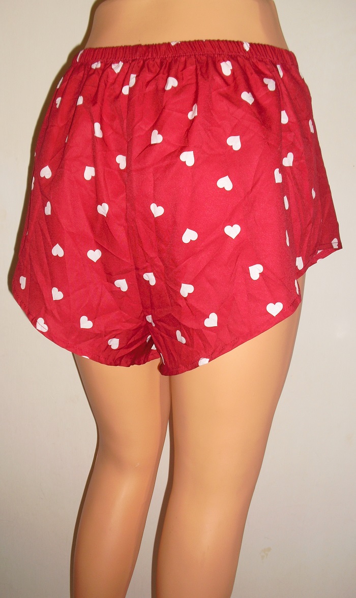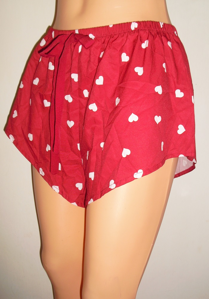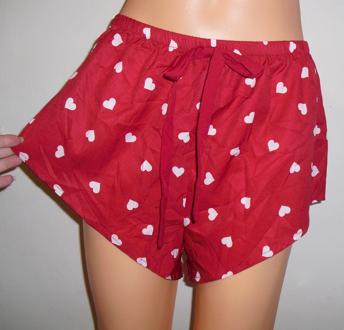 🩷predam nadherne romanticke cervene so srdieckami zdobene krataskove nohavicky na spanie, nadhernom vybornom stave, velkost uvedena l . pas elasticky 36 cm x 2 az 51 cm x 2, vyska predok stred 31 cm, bok kratsia strana 24 cm.