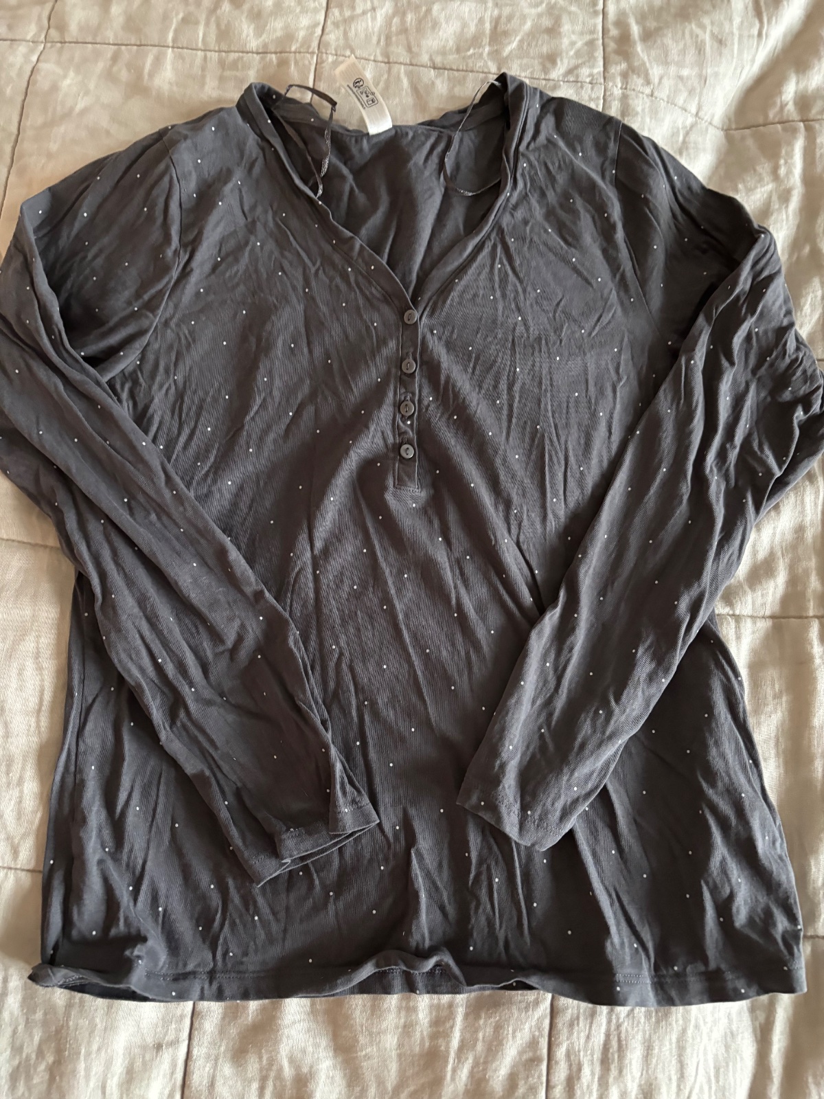 Veľmi dobrý stav! Dámske, dievčenské sivé pyžamo vrch s potlačou, elastické. ROZMERY: dĺžka meraná vzadu:62,5cm, dĺžka rukáv od krku:62cm, dĺžka rukáv:56,5cm, pod pazuchami meraná šírka:2x44,5cm, ...