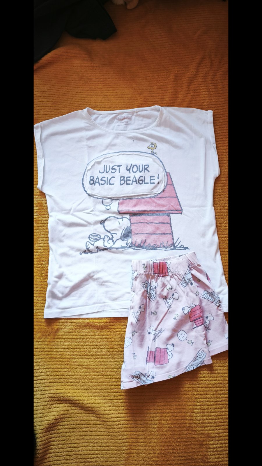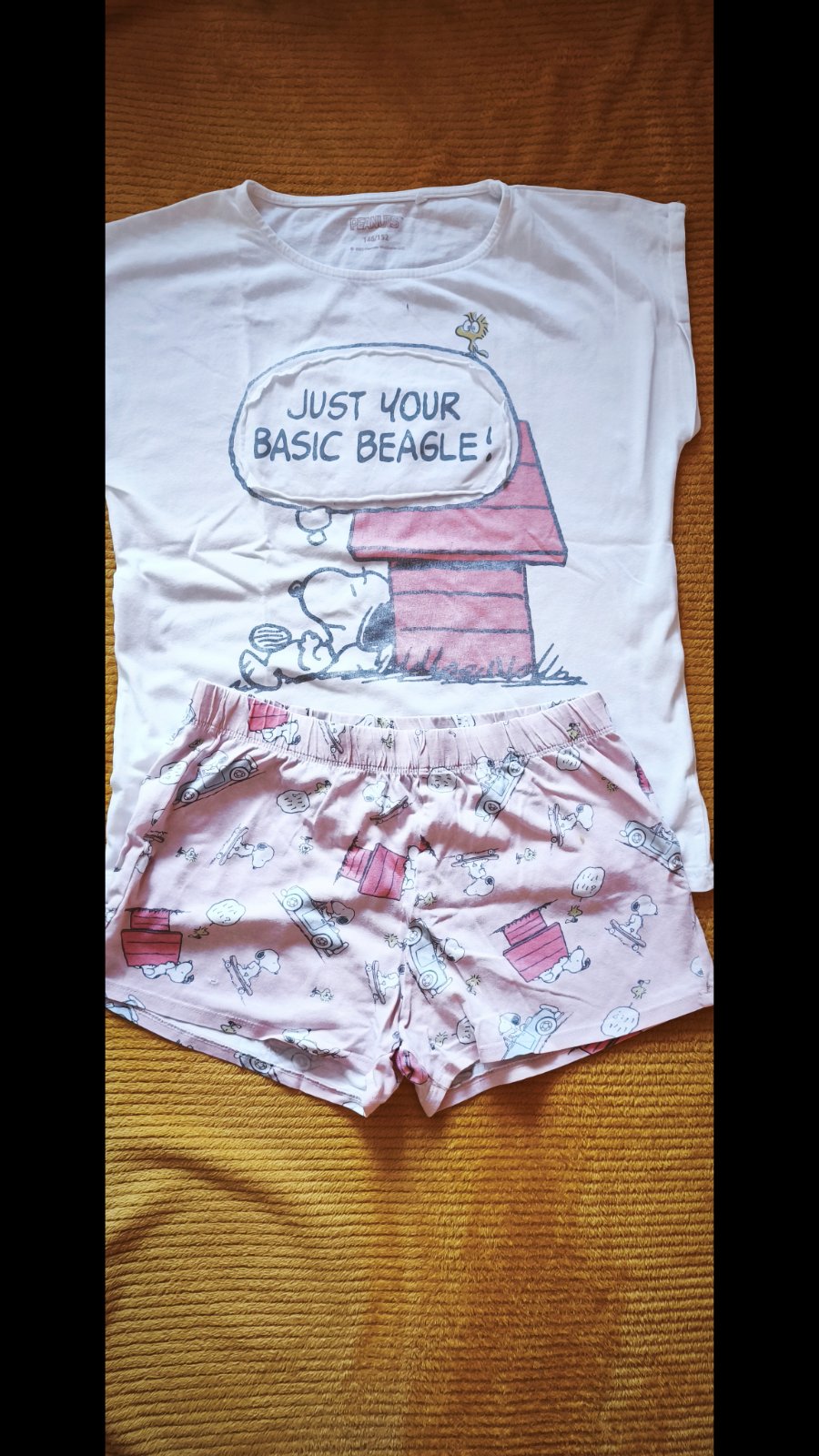Krátke pyžamo so psíkom Snuppy. Tričko je bez rukávov biele a nohavice sú bledo ružové s motívom. Veľkosť je 146/152.
