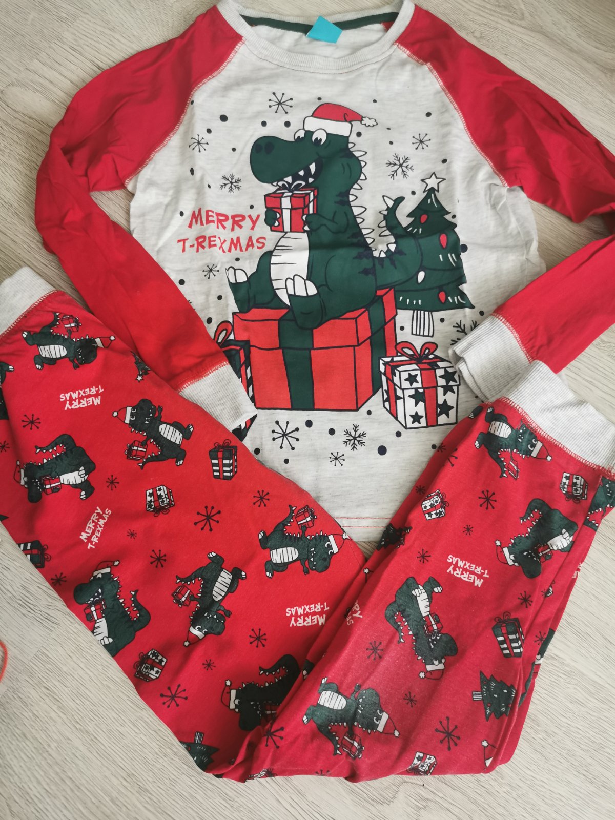 Krásne vianočné pyžamo, veľkosť 122/128, bez poškodenia akurát na kolenách vidno nosenie.V