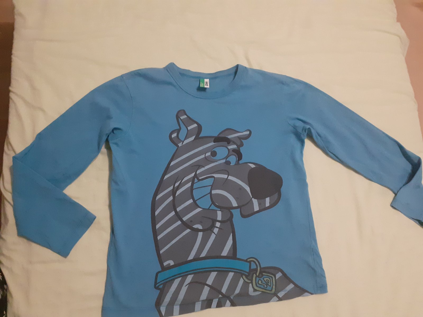 Nosené, dobrý stav, farba nevypratá, bez fľakov, na ľavom rukáve (dole vzadu) zašitá malá dierka(posledná foto) inak super stav, tenké, 100% bavlna, písaná veľkosť 140 (podľa mňa je menšie)