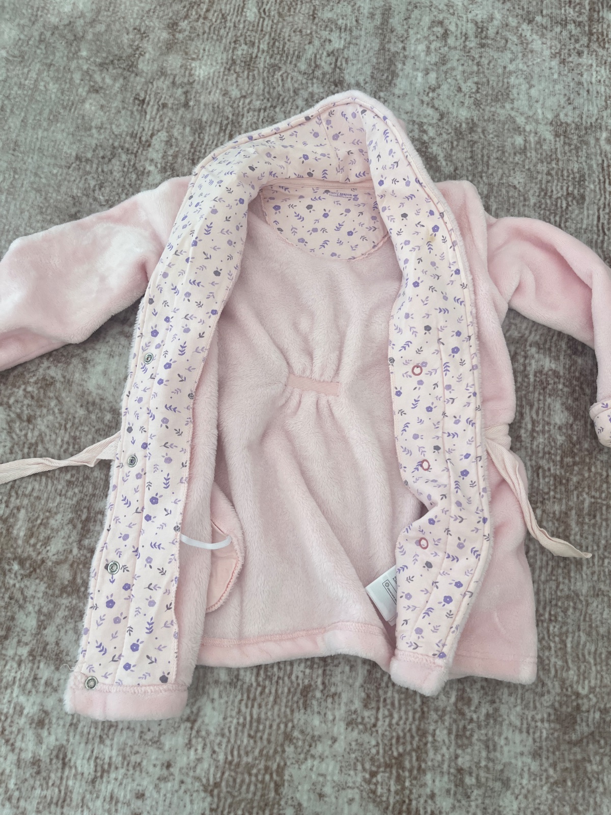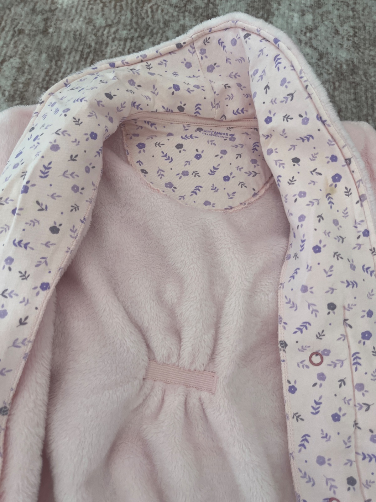 Dievčenský župan na vek 4-5 rokov. Dlžka 70cm, dlžka rukáva 35 cm. S opaskom na uväzovanie. Nosený. V dobrom stave. Nemá diery ani škvrny.