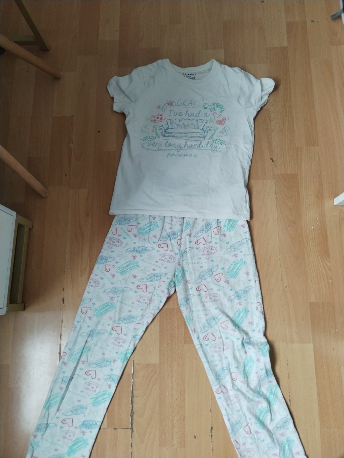 Velmi pekné nosené pyžamko, žiadne vážne poškodenia poslúži. Vrch D:53cm Š:40cm Rukáv vr. krku 61cm Spodok Pás: v klude 31x2 D:88cm