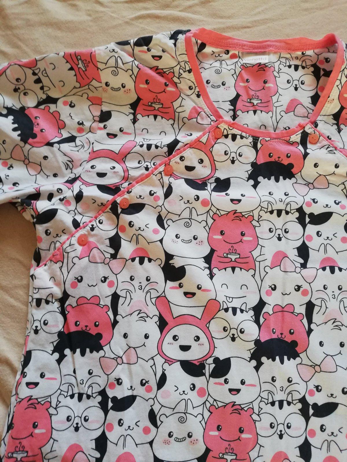 Dámska bavlnená nočná košeľa materská s krátkym rukávom. Nočnú košeľu zdobí potlač obrázka. Košeľa je určená na dojčenie, v oblasti pŕs má otvory zapnuté na gombíky. Materská košeľa je vďaka voľnej...