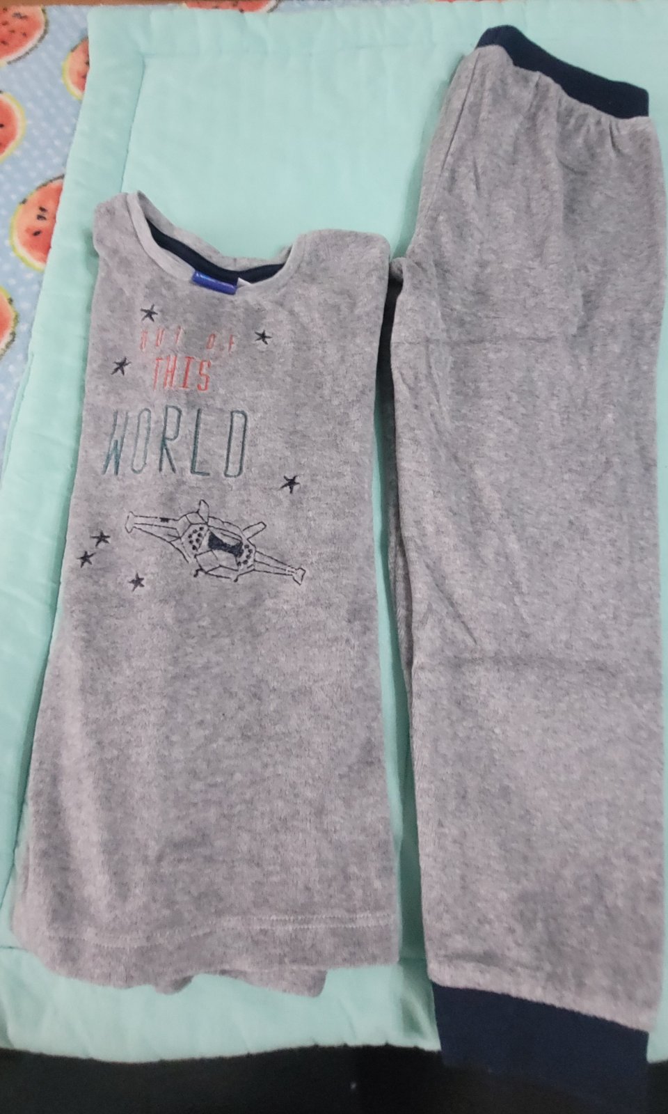 Vyskladane pyzamko. Nohavice velkost 110/116, nosene, bez dier a flakov. Nie je sprane. Rozmery: tricko dlzka 44cm, rukav merany od krku 44cm nohavice dlzka od pasa 63cm, v rozkroku 44cm, pas 23cm