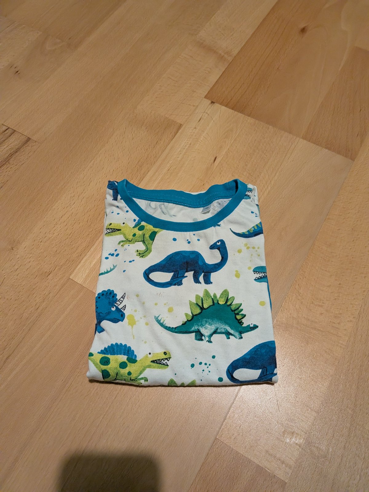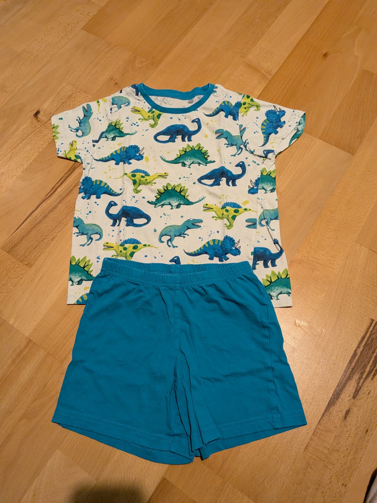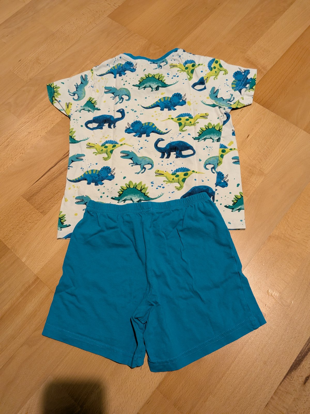 K obom pridám pyžamo s dinosaurami z C&A, veľkosť píše 122, ale sedí tak ako tie z Tchiba na 110/116.