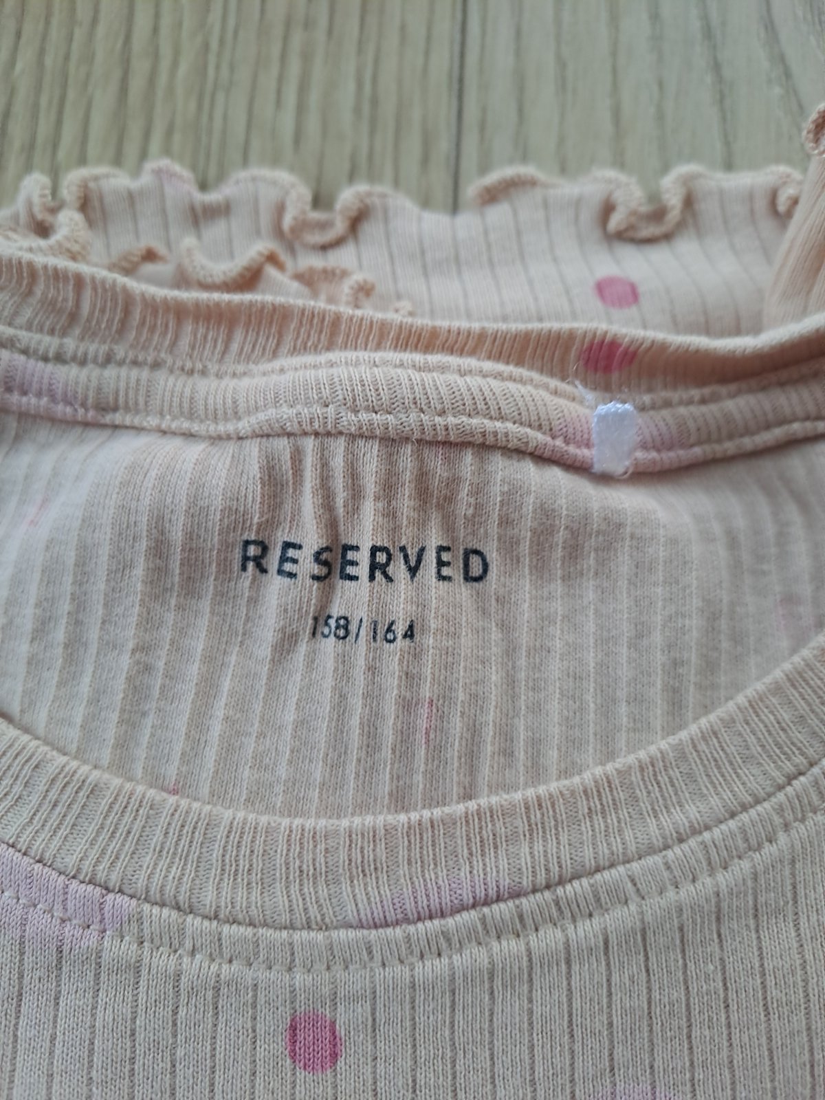 Biele s hruškami č.158/164 Zn. Reserved. Spodný diel - pás na gumu meraný v kľude 2x31cm. Celková dĺžka 87cm, vnútorná dĺžka 66cm. Vrchný diel - celková dĺžka 65cm, rukáv od krku 65cm, spodný rukáv...