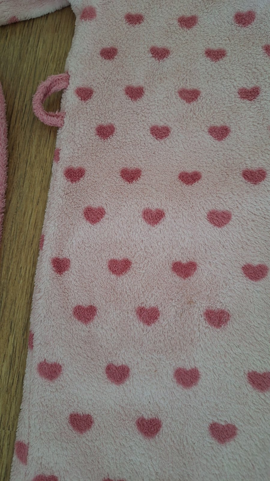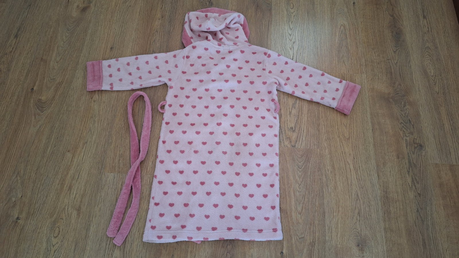 Ružový župan, veľkosť neviem, len rozmery: dĺžka 65 cm, šírka ramien v ramenách 34 cm, dĺžka rukávy 41 cm