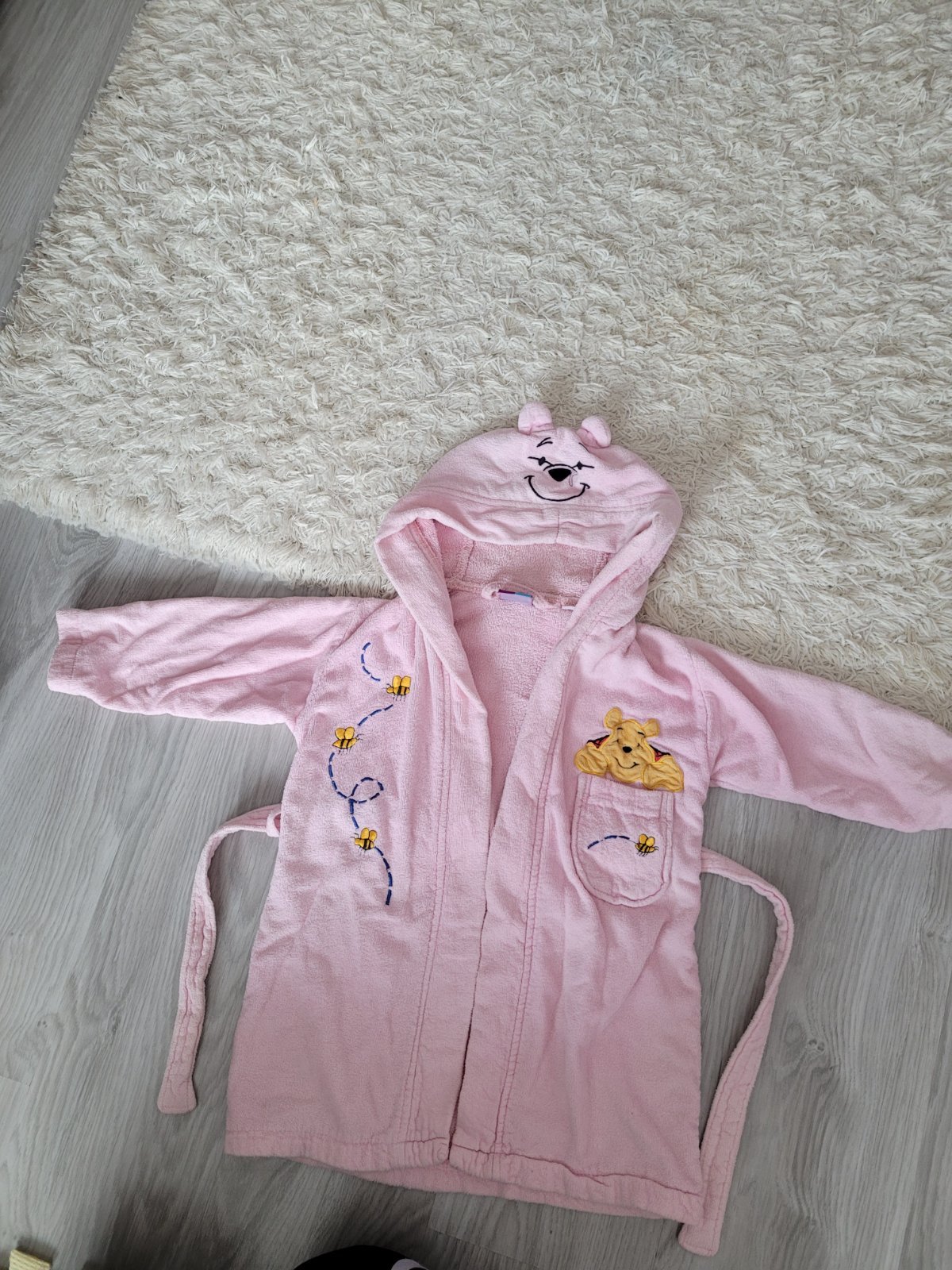 Župan veľkosť 116/122. zachovalý, iba na rukávoch slabé žlté miesta - skoro ich voľným okom nevidieť, ale spomínam je to aj na foto. Rozmer od krku rukáv 42 cm a celková dĺžka 61 cm. Cena 4 eura