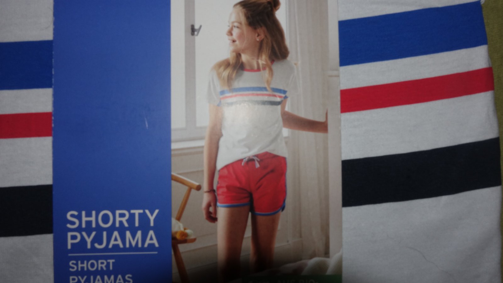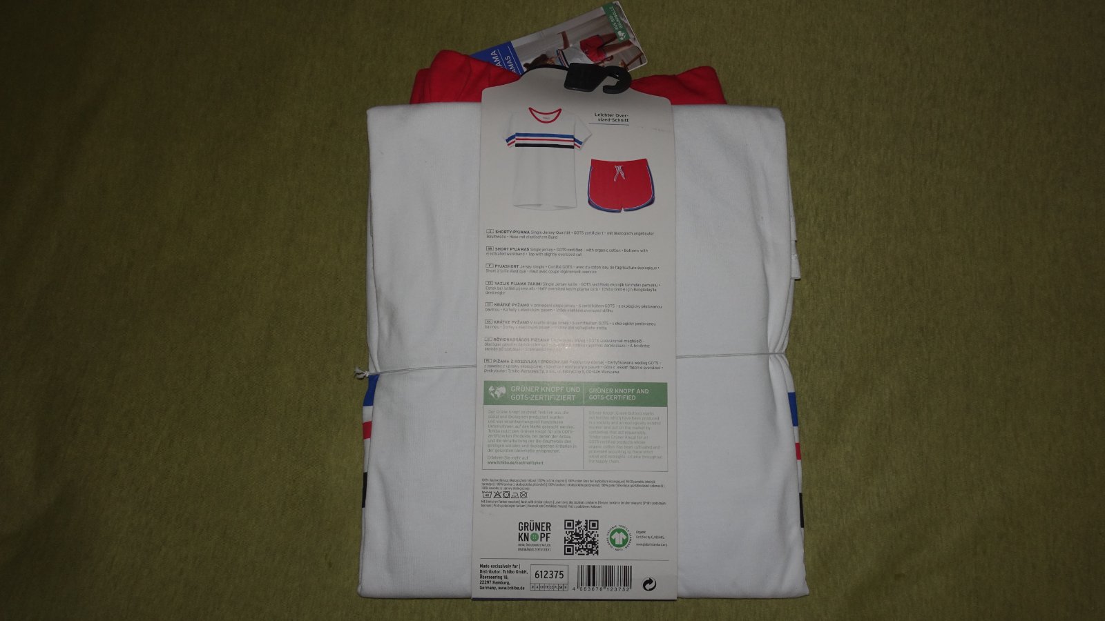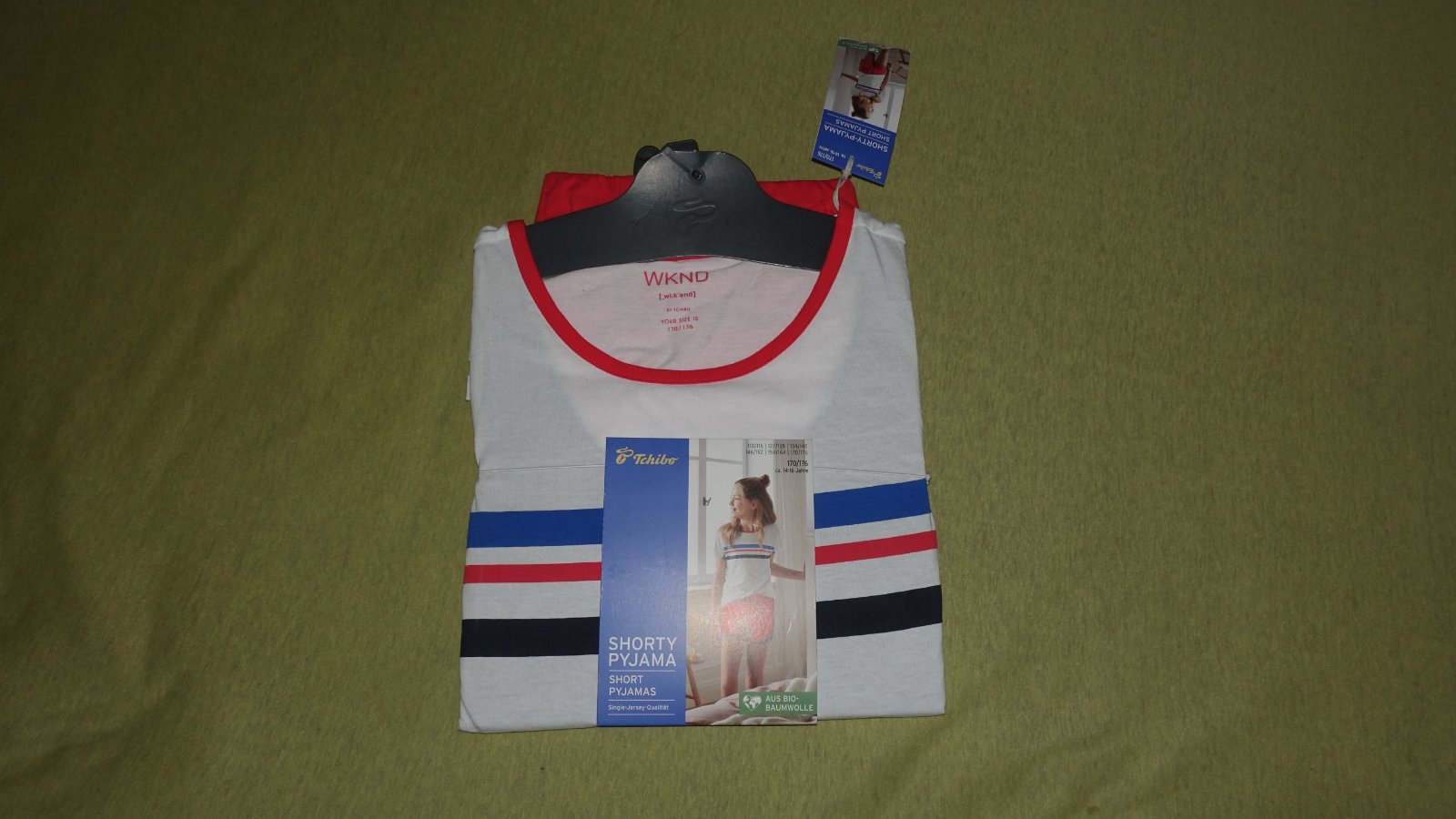 Pekne pyzamo na leto- nove, s visackami. Pozostava z tricka s kratkymi rukavmi a krataskov. 100% bavlna. Je vo velkosti 170/176.