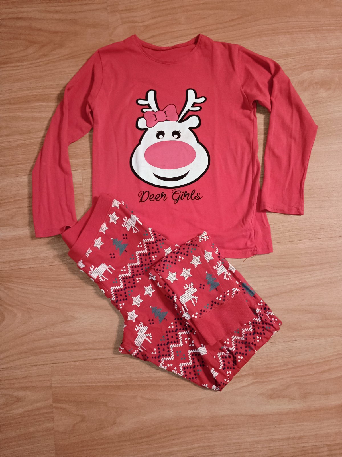 Vianočné pyžamko, kvalitné, bez šmolkov, tričko sa dá nosiť aj ako bežné tričko. Dĺžka rukáva 52 cm, šírka 2x37 cm, nohavice obvod max. 2x37 cm. Nohavice majú vpredu ozdobné gombíky, iba našité, nedajú sa odopinať.