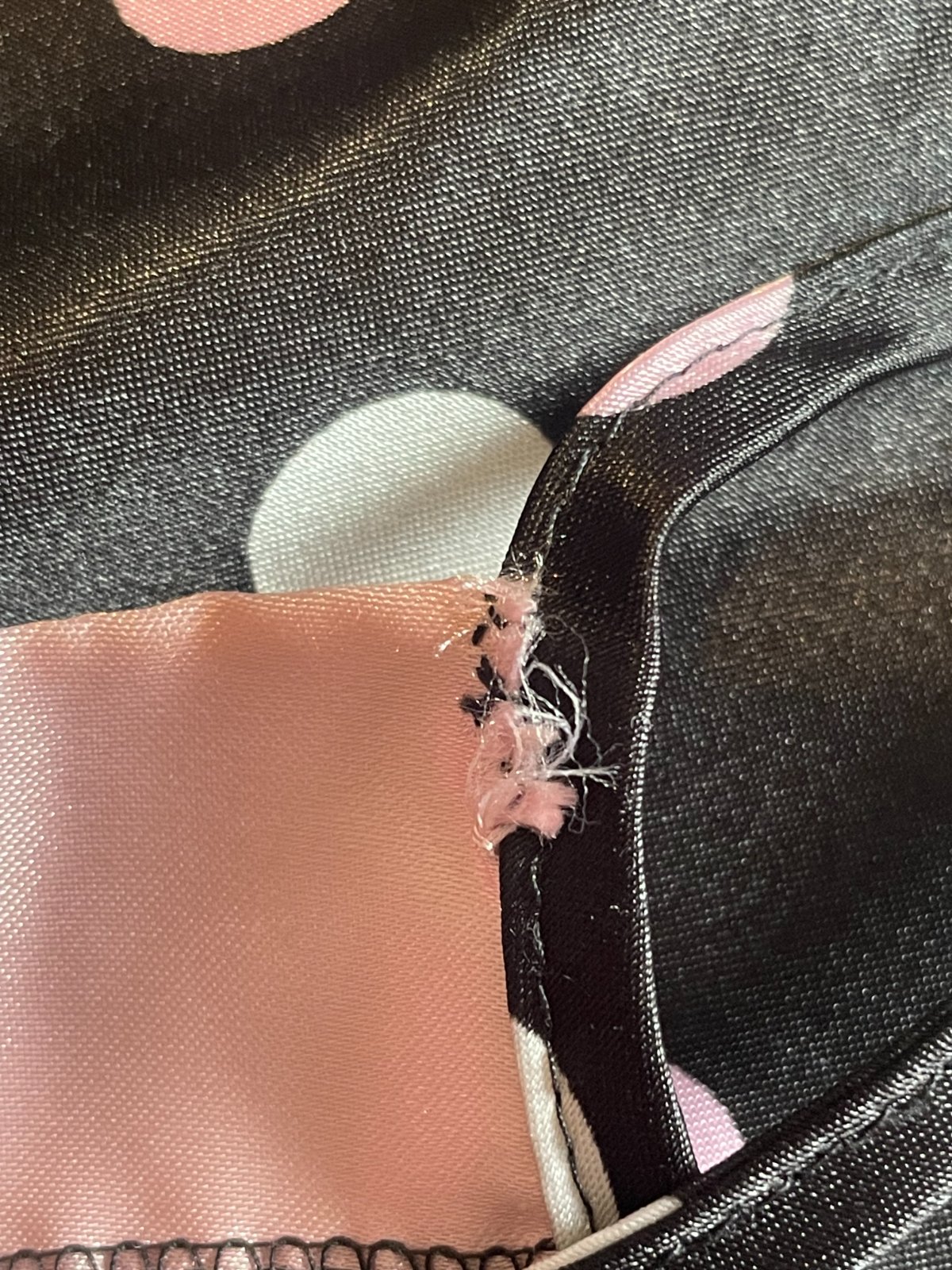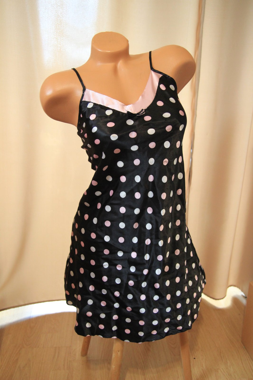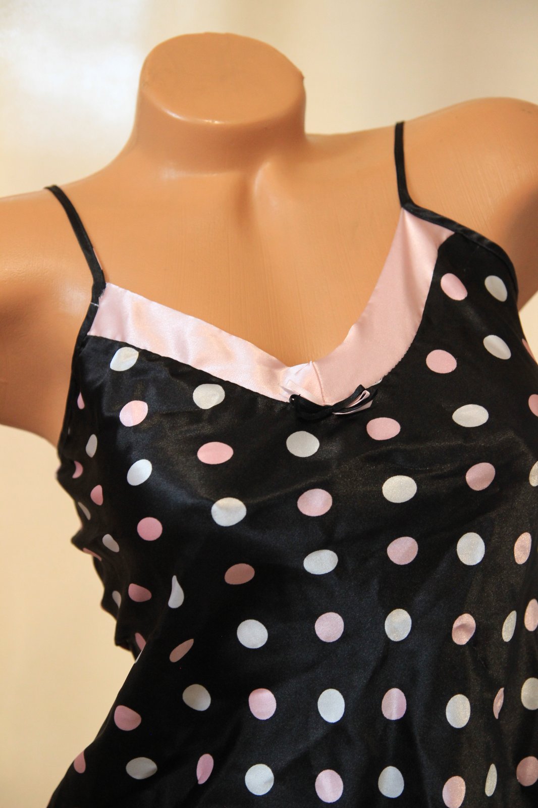 Čierno ružová bodkovaná saténová košieľka na spanie, dĺžka ramienok sa dá regulovať. Veľkosť XS. Na jednom kúsku je zašitá - posledná foto.