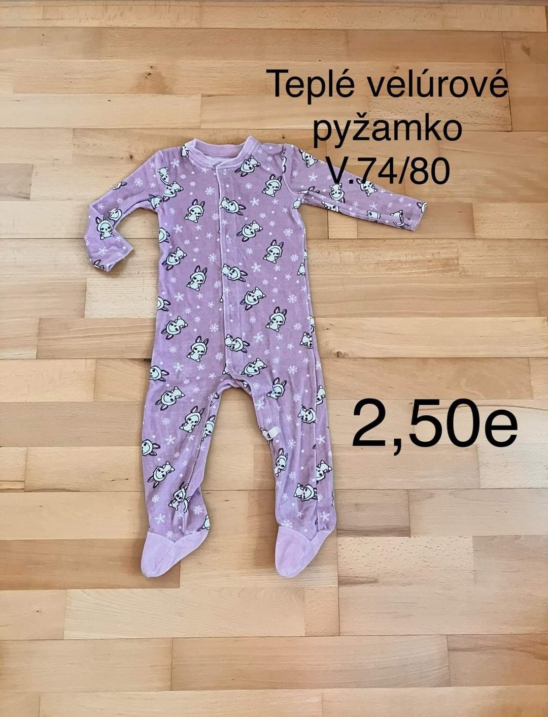 Pekné zamatové teplejšie pyžamko slovenskej výroby. Nenosené ani raz. Bolo nám malé, nakoľko je uvedená veľkosť nesprávna. Určite je to 74 a nie 80. Patent na rukávoch. Farba je ružovo-biela. Perfe...