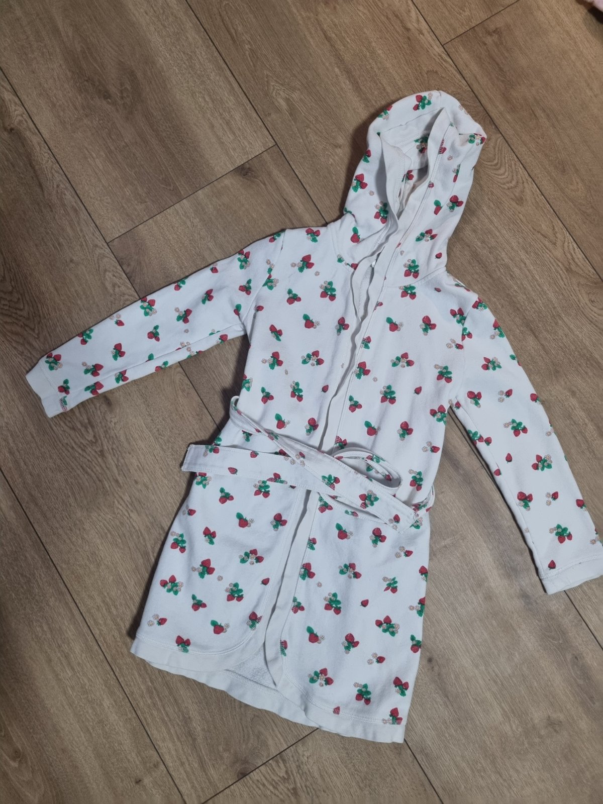 Ponúkam menej nosený župan na 5-6 rokov. Vzadu je gumička. Veľmi pekný nosený stav, poškodenia som nenašla. Dĺžka od ramena pri kapucke cca 76cm, rukáv od kapucky cca 50cm.