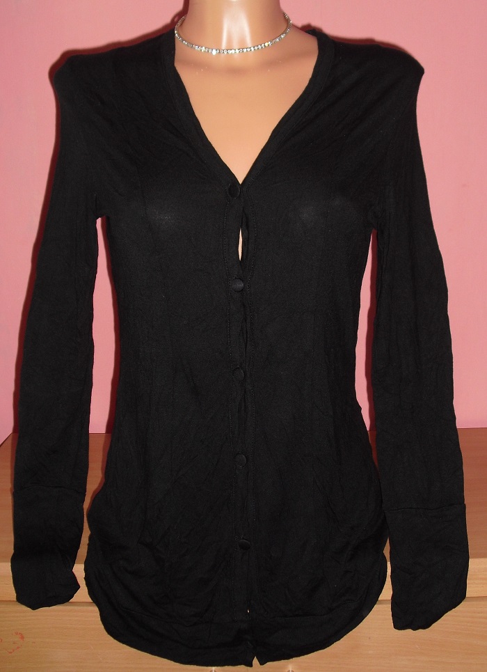 predam nadherny zupancek , bavlneny, jemnucky, nepichlavy material, prijemny na telo, zapinanie na gombicky, znackovy. velkost ide na s, s/m. tmavo cierny, nadhernom stave, sirka klude 42 cm x 2, dlzka 74 cm.