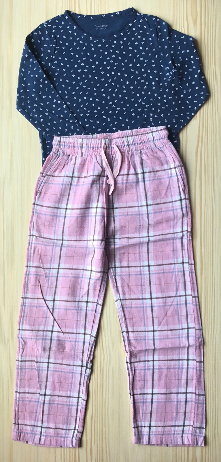 Bavlnené tričko s dlhým rukávom značky Minymo a flanelové pyžamové nohavice značky Lindex vo veľkosti 128 v peknom nosenom stave, vhodné na nosenie aj počas chladnejšieho obdobia.