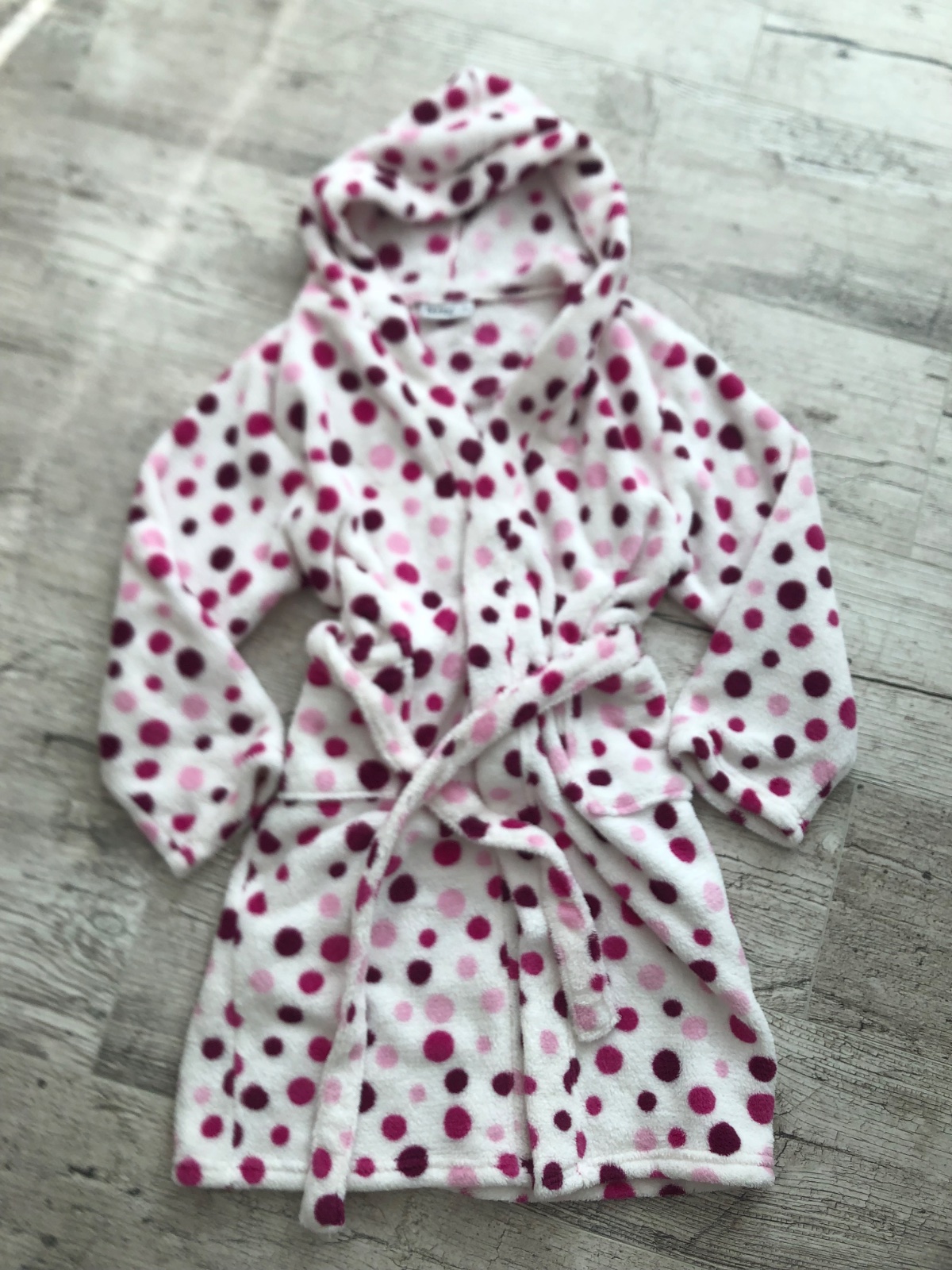 Predám veľmi pekný župan s kapucňou a s vreckami pre dievčatko, veľmi málo noseny. Rozmery: celková dĺžka 84, dĺžka rukáva od krku 57, šírka pod pazuchami 48, ale je tam preloženie 11 cm.