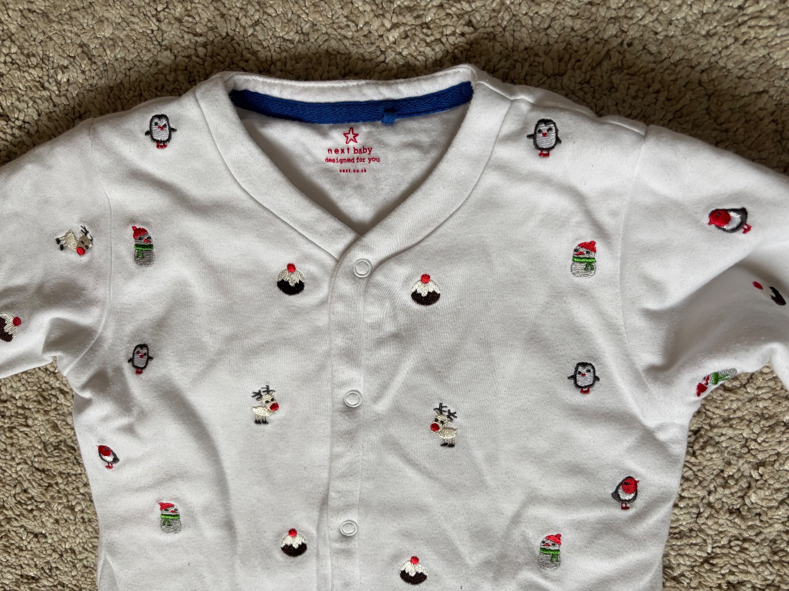 Zateplené hrubšie pyžamko Next overal veľkosť 86/92. Dá sa použiť aj ako spací vak z bavlny. Kvalitné s milým zimným vianočným vzorom bez poškodení.