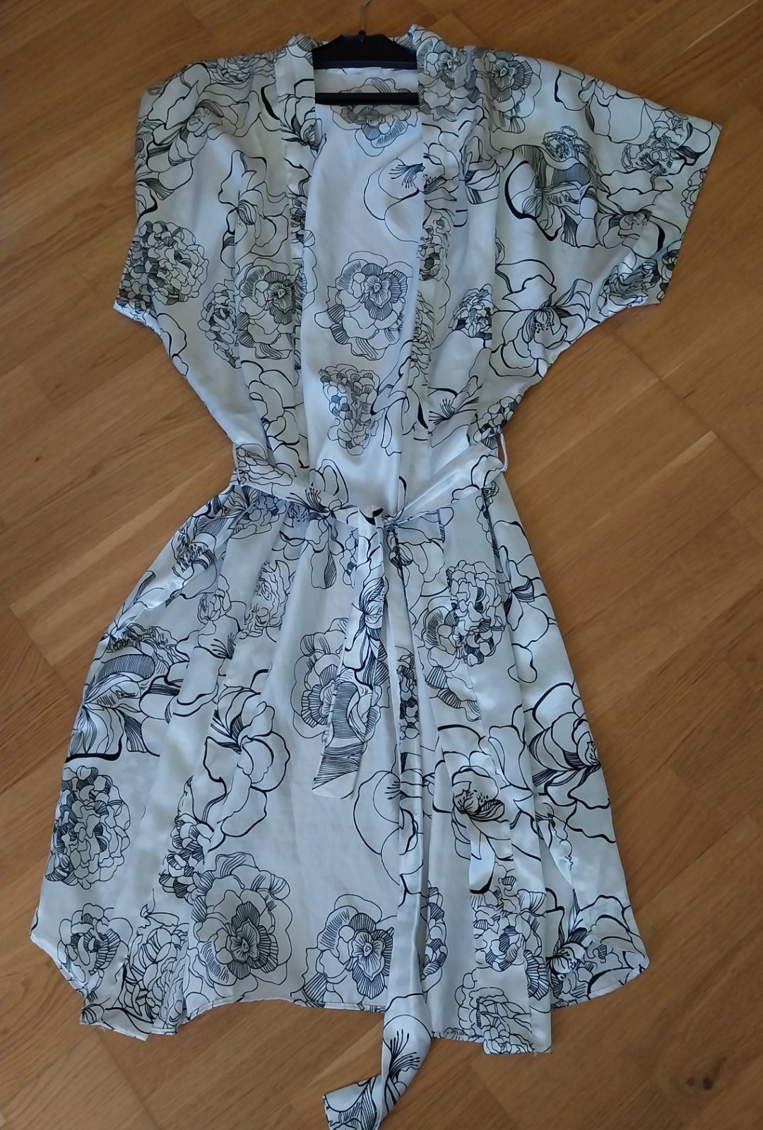 Saténový tenký župan, párkrát na sebe. Super stav. Zaväzovanie vo vnútri + opasok z vonkajšej strany. Veľkosť XS/S/M.