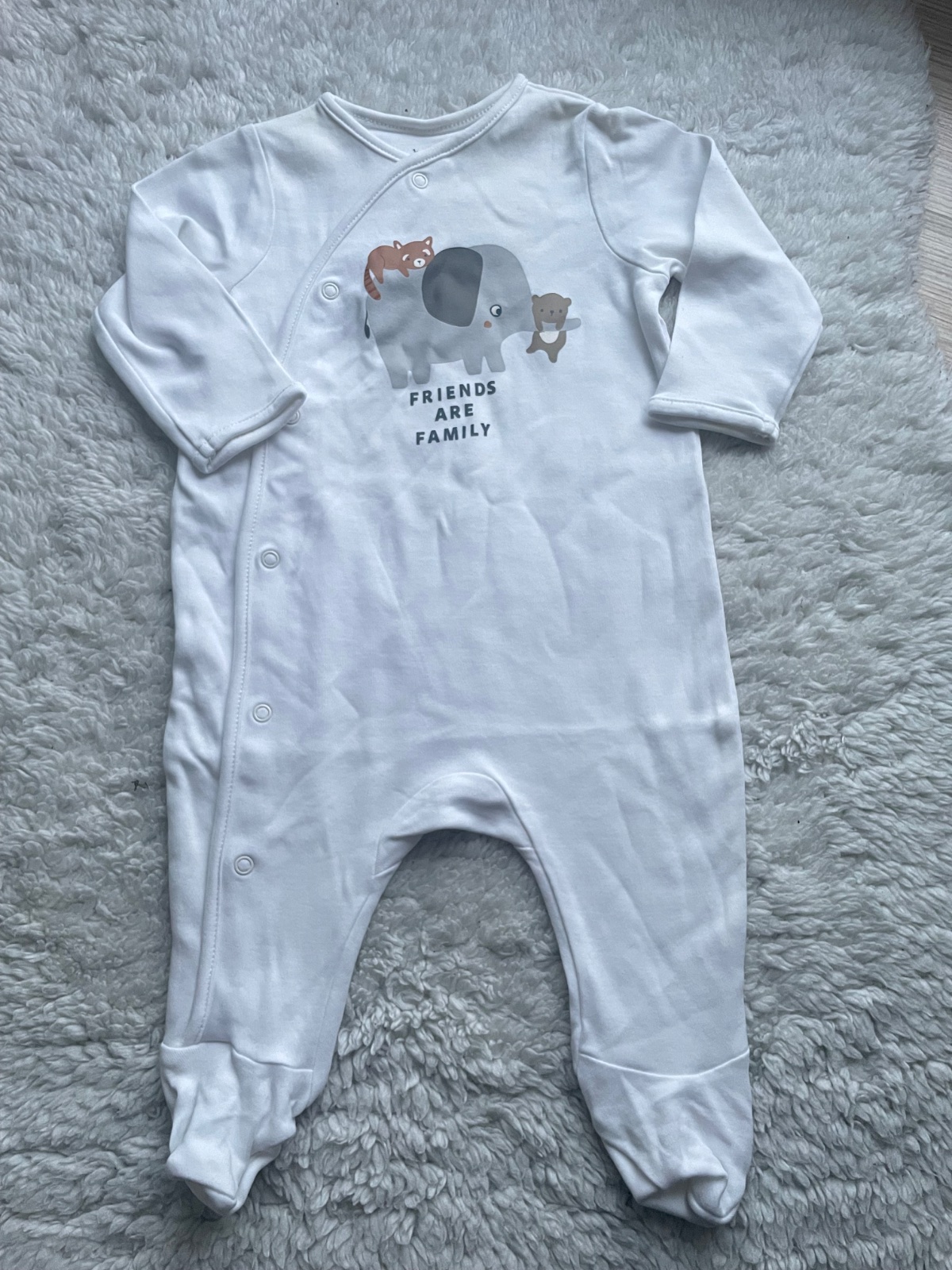 Bavlnene celodupackove pyzama so zapinanim na cvocky, raz oblecene, bezchybne, biele so zvieratkami, svetlosede s tigrikmi, tyrkysove s lenochodom. Velkost 62