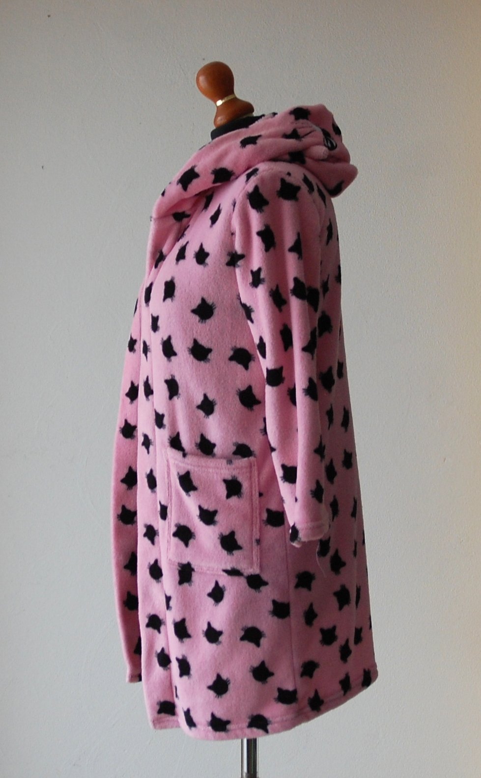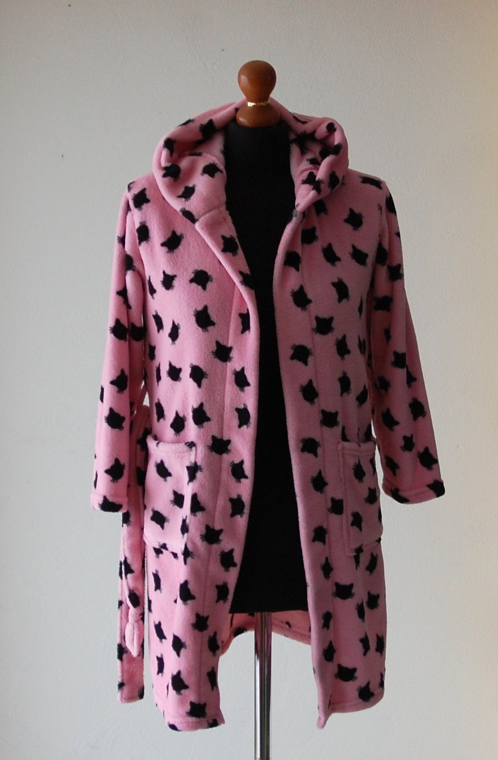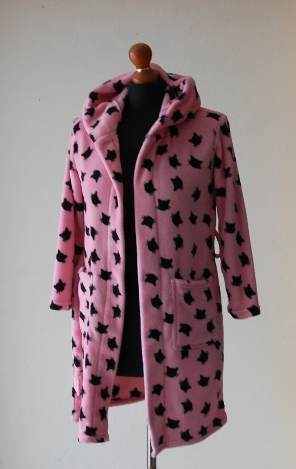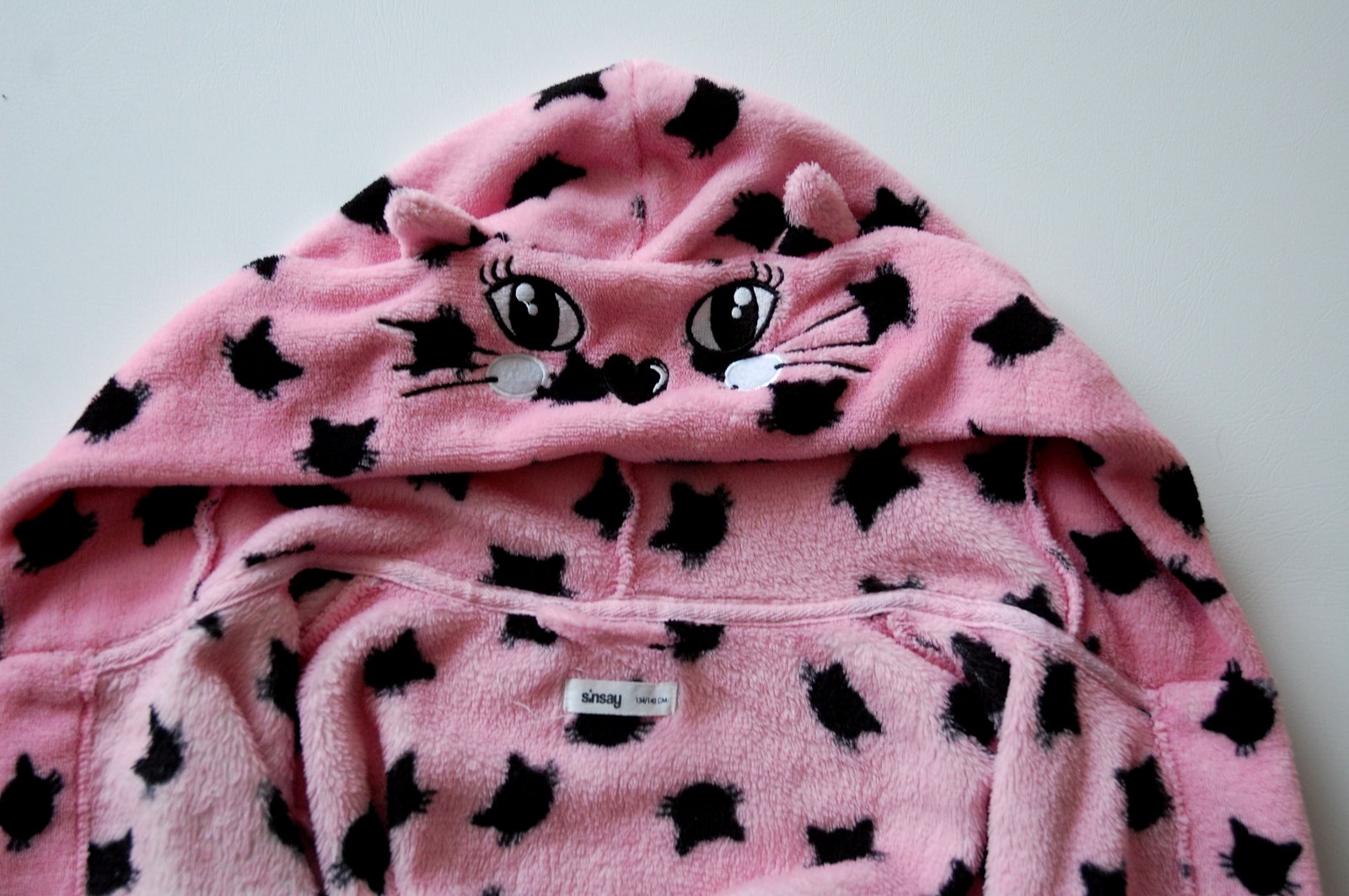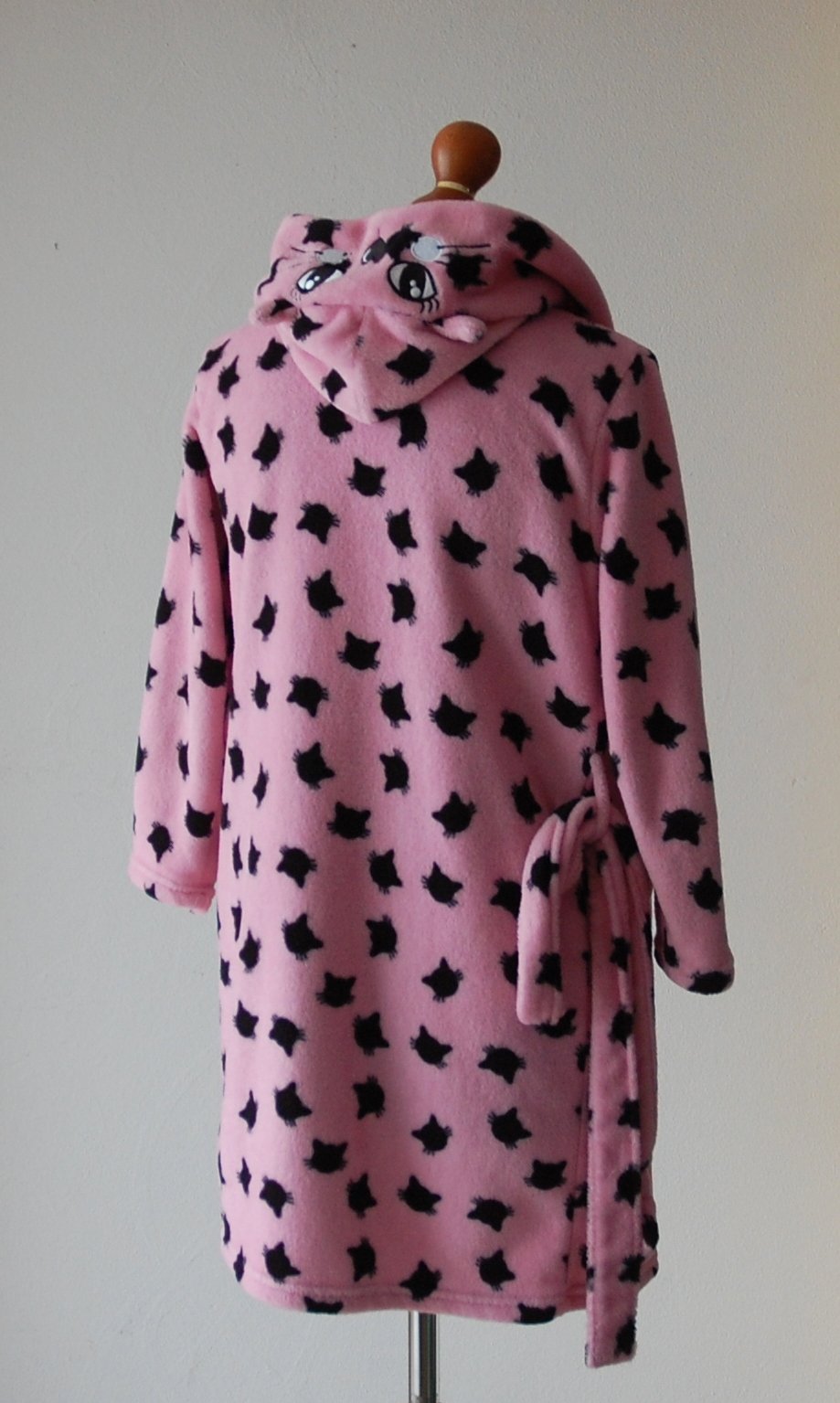 Predám nádherný dievčenský župan v žiarivej ružovej farbe s roztomilým vzorom čiernych mačičiek. Župan je v super stave.