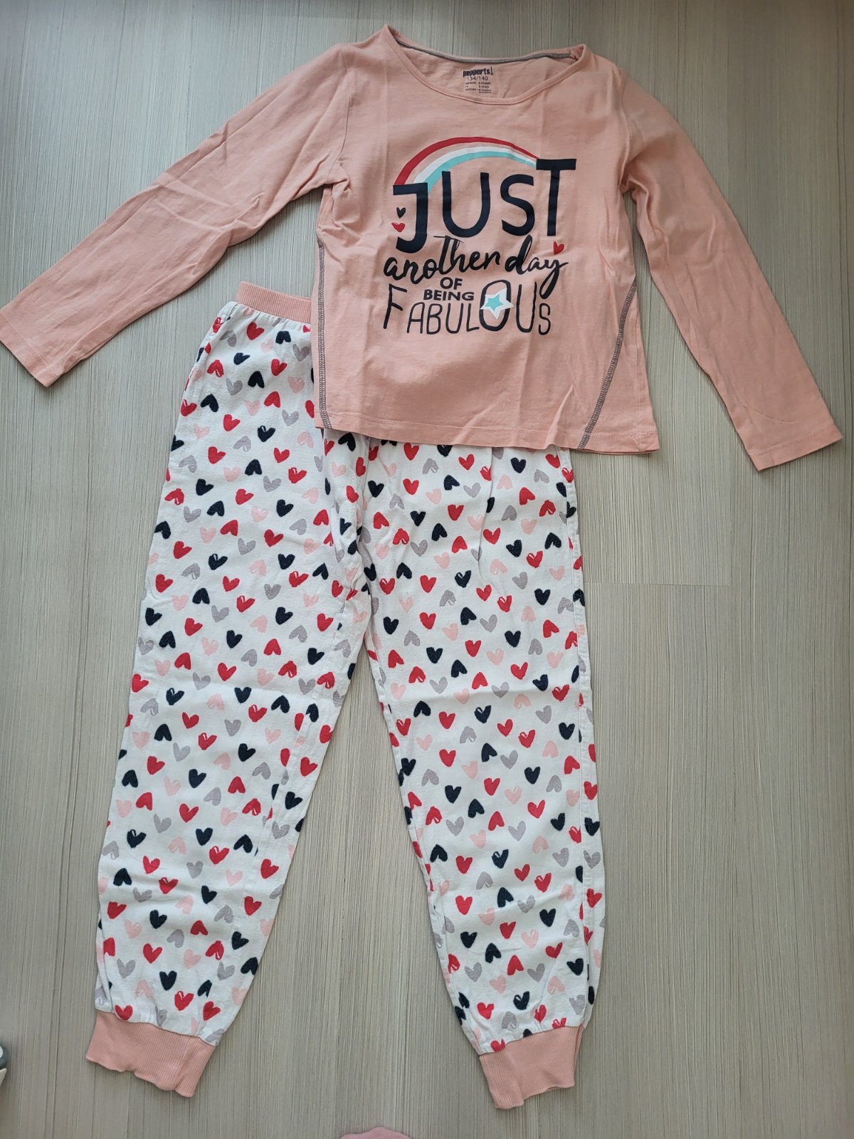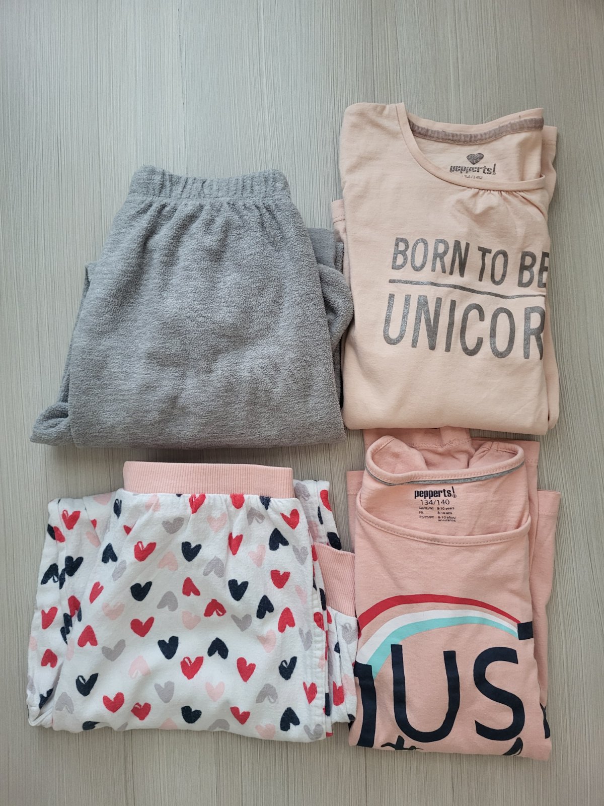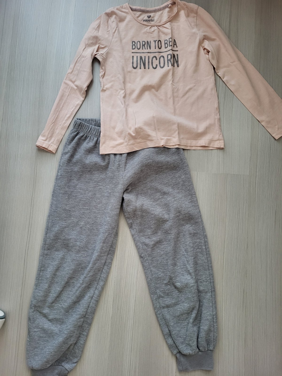 Predám nosené pyžamo. Vrch biela, nohavice hrubší material, ružové. Nohavice dl:80cm, š.: 30cm, vrch dl:52cm, rukáv od krku: 59cm. Veľkost 134/140.