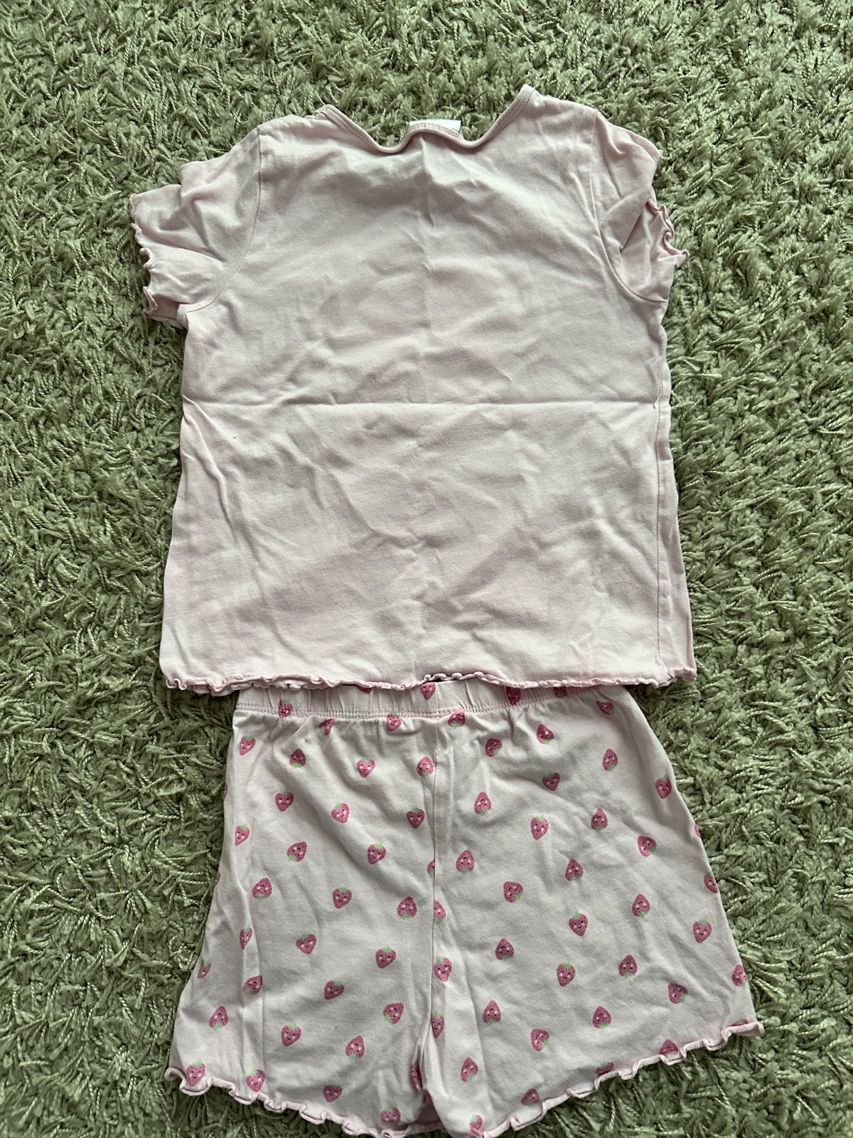 Pyžamko s jahodou vo velmi peknom nosenom stave,velkost na stitku 110/116,nema ziadne nedostatky